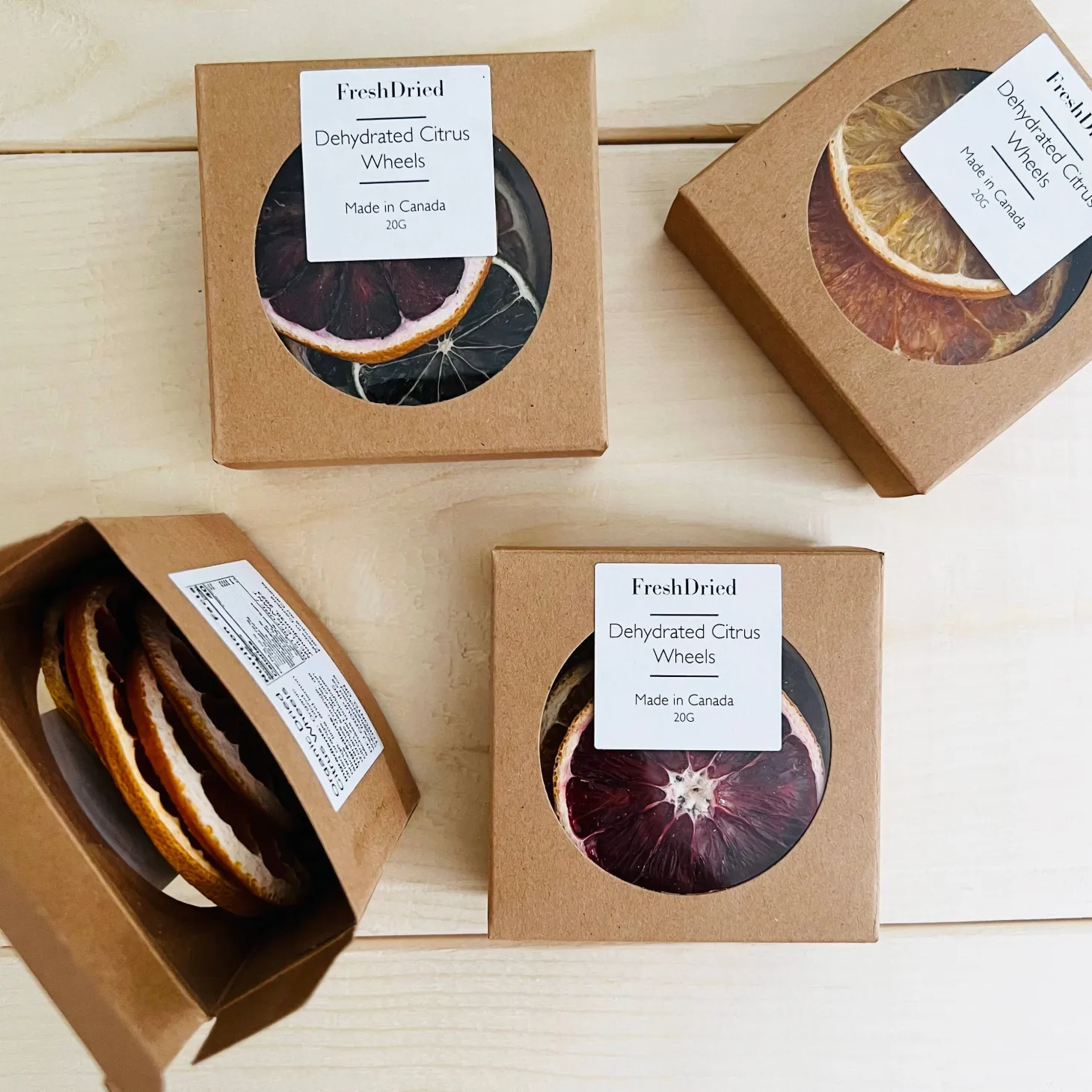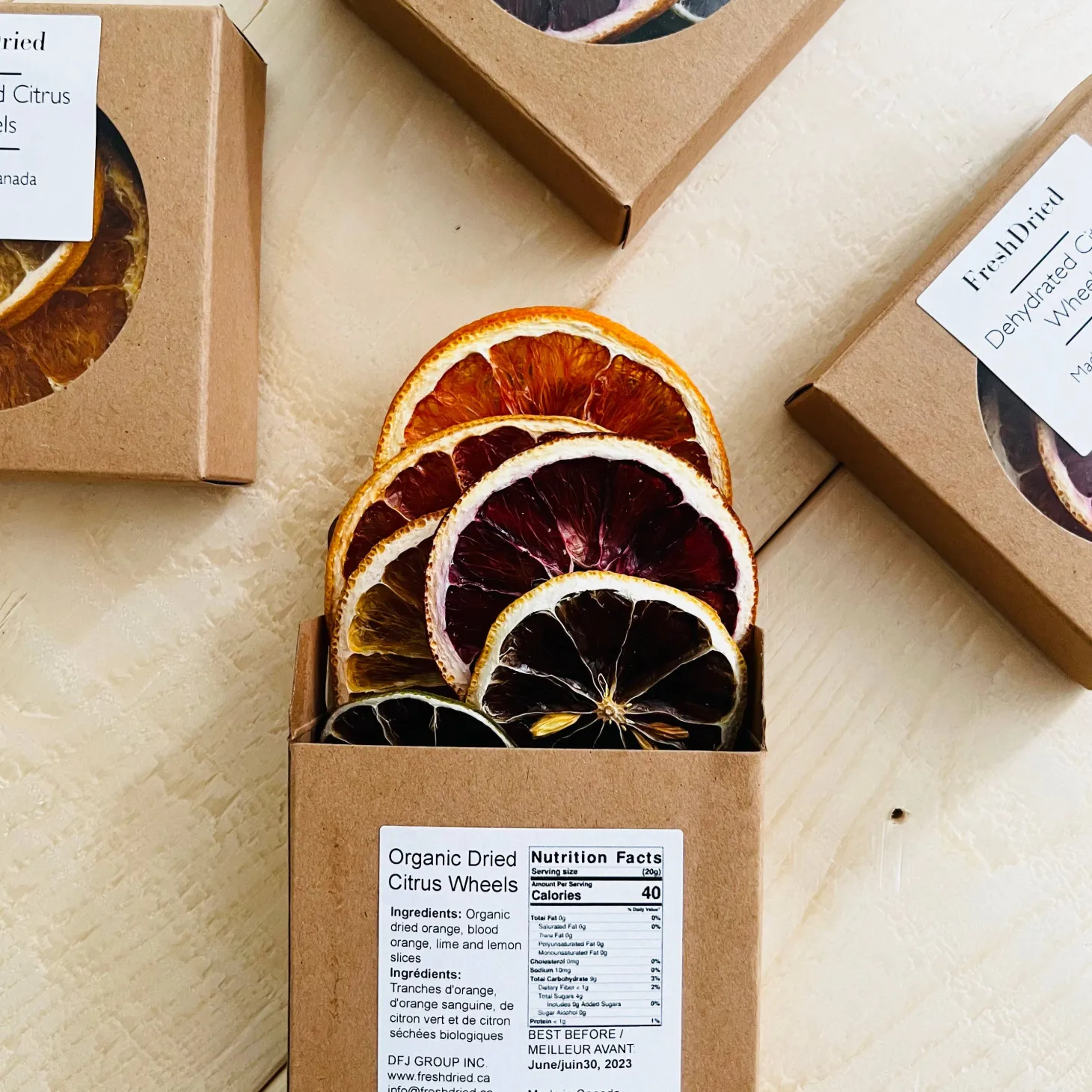 Each box contains 15–20g of 100% natural dehydrated fruit. Choose from: blood orange, cara cara orange, navel orange, grapefruit, tangerine, lemon, and lime, apple, pear, persimmon, pineapple, kiwi, and peach.