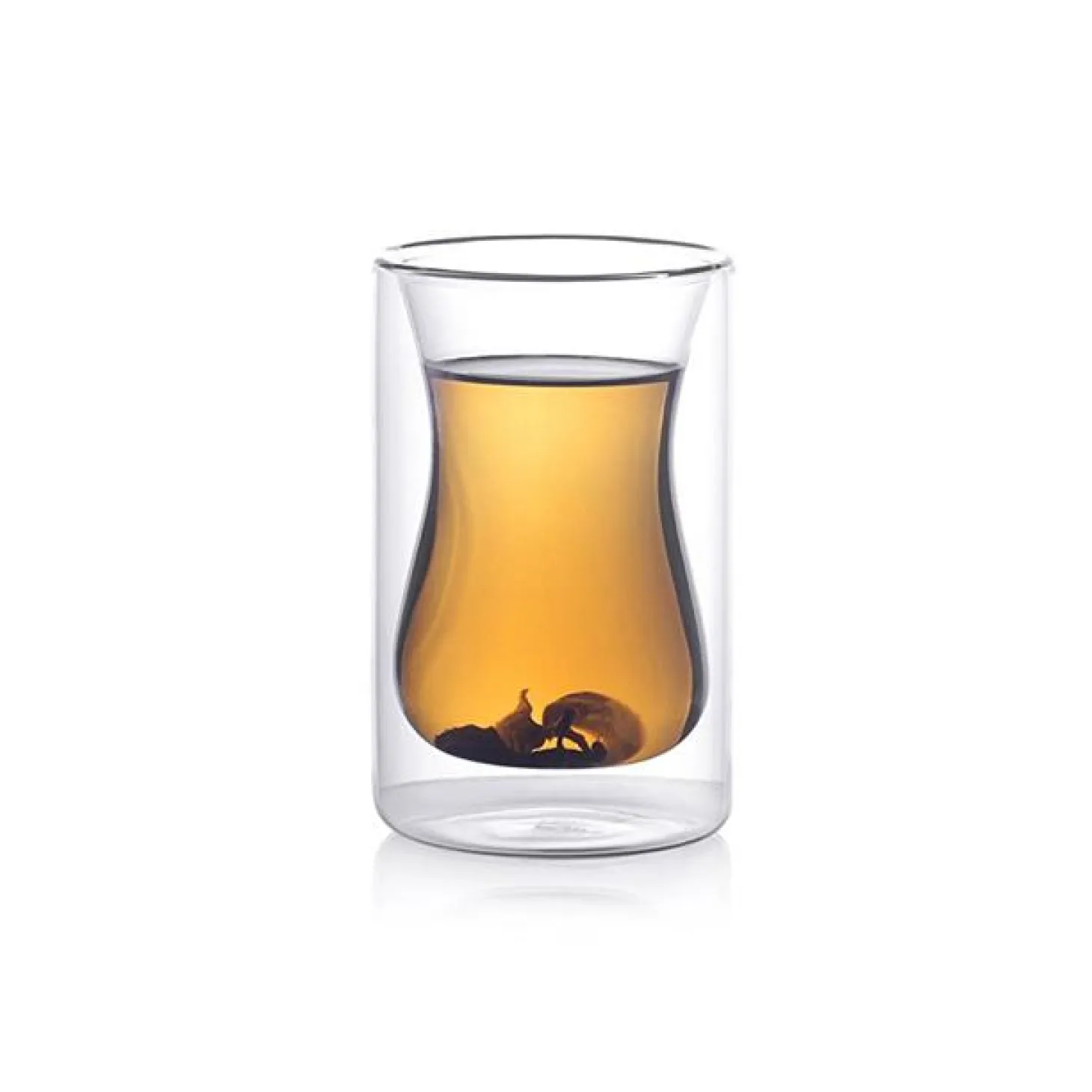The inner layer is a nod to the traditional hourglass shape of Turkish tea cups while the outer wall is modern and sleek. The two walls of borosilicate glass create an insulating layer, so tea stays hot but isn’t too hot to hold.