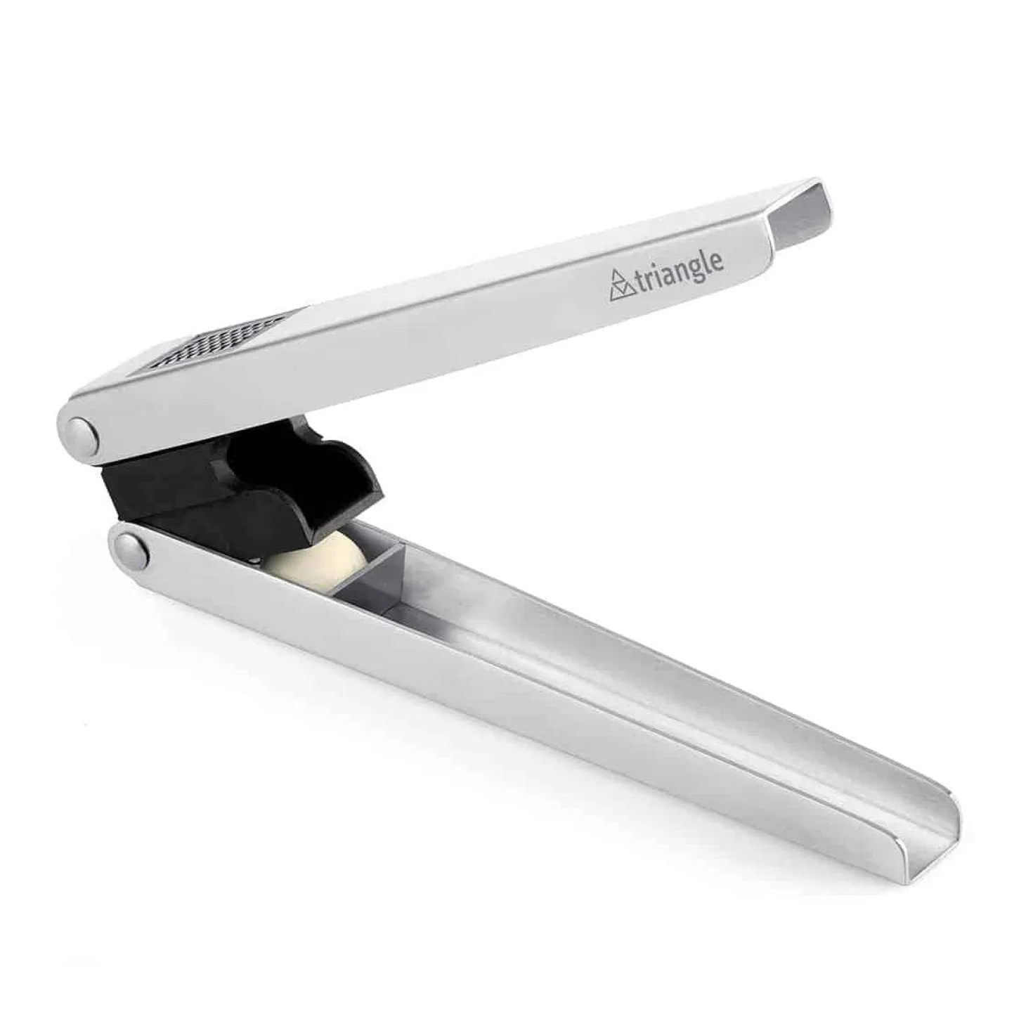 It can be opened completely for cleaning. A cleaning grid removes garlic residues from the stamp and ensures quick cleanliness.