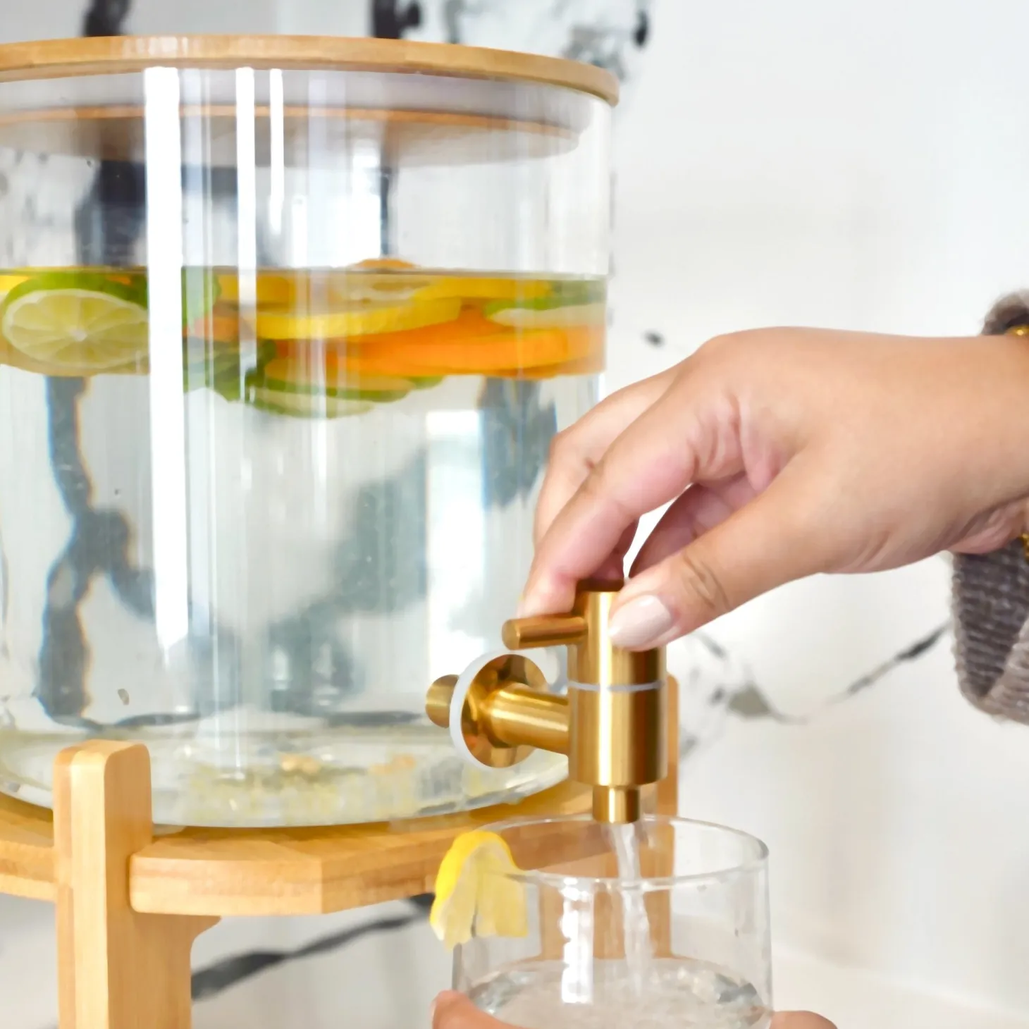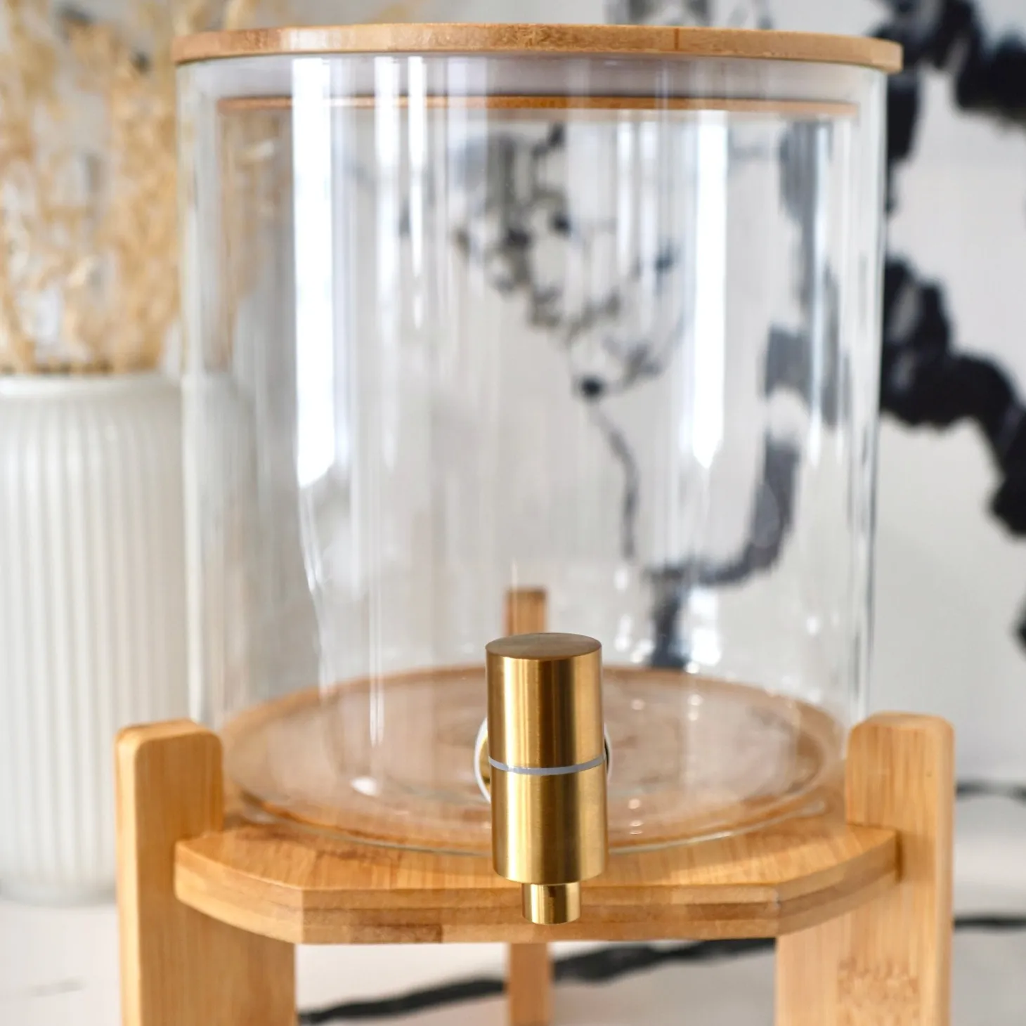 A clear glass cylinder displays your beverage creations atop a wood stand. Easily refill by lifting the wood lid. Turn the spout to pour your favorite lemonade or sparkling fruit water and turn it back to close it.