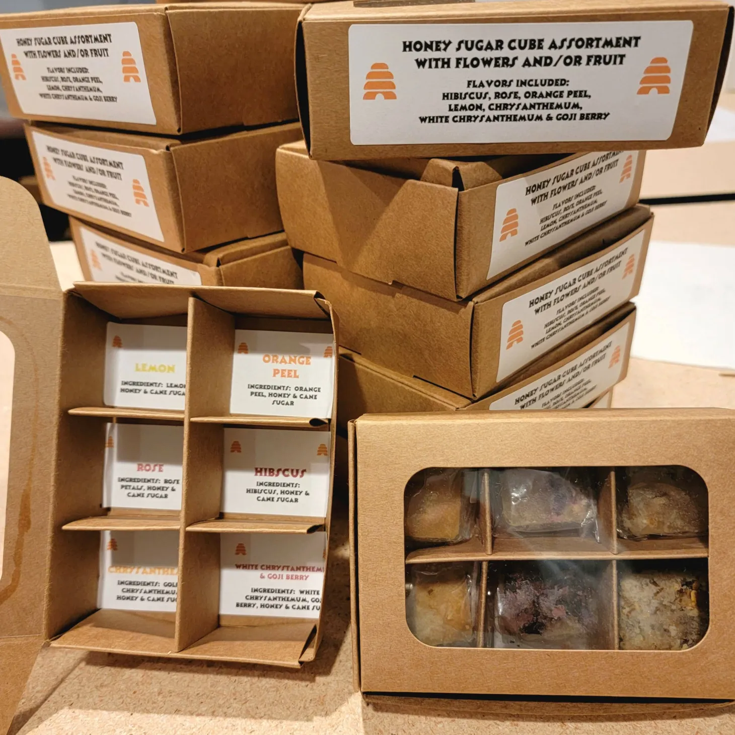 Gourmet Honey Sugar Cube Singles – Purchase by the single cube – individually wrapped or assortment pack (box might differ in color kraft or white)Just add hot water to soften and add to any cocktails, champagne, coffee, hot tea, water, and more!