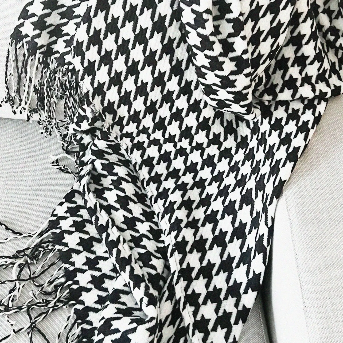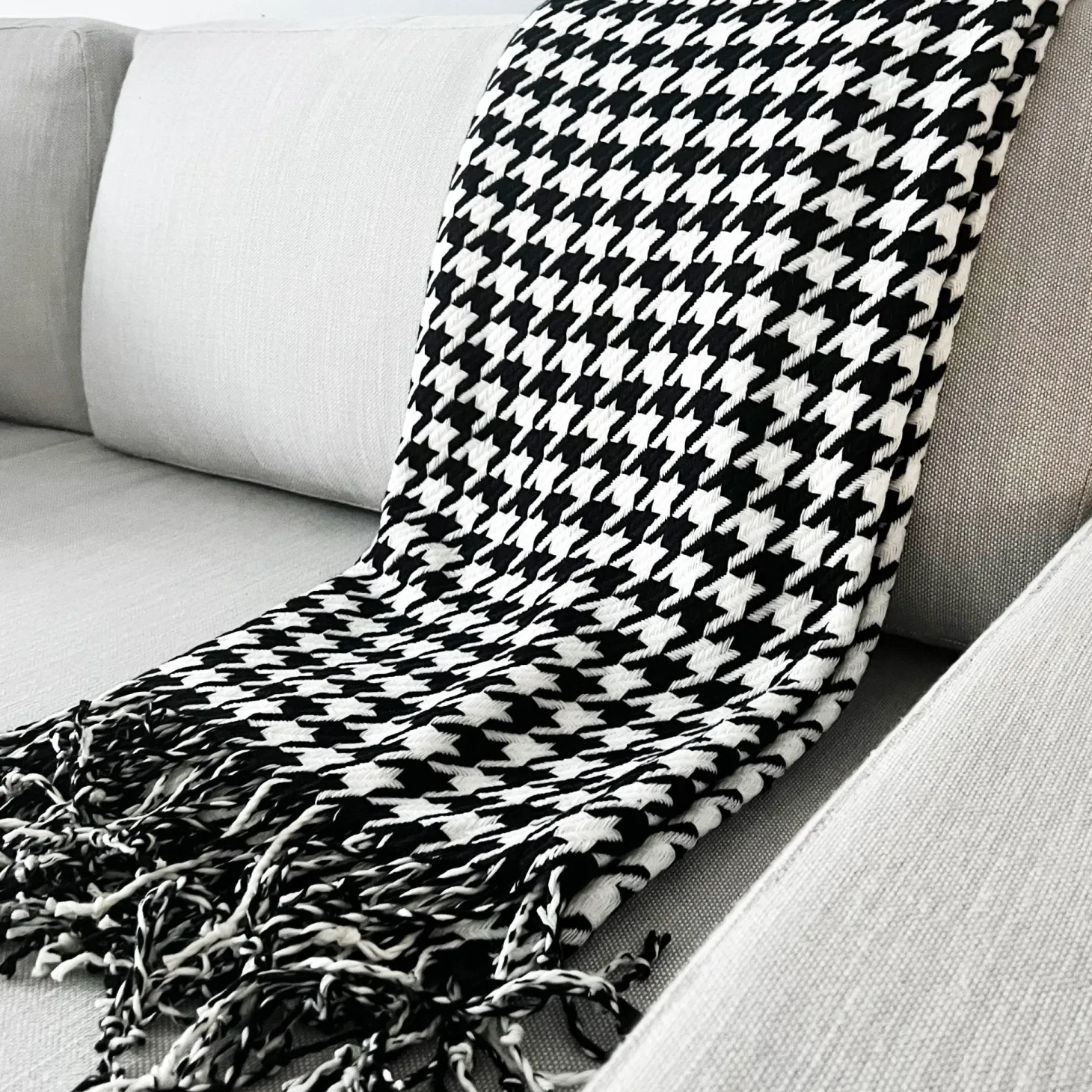 Snuggle up with this cozy houndstooth throw blanket. The timeless black and white pattern will look stunning draped over an armchair, at the end of the bed or on the sofa.