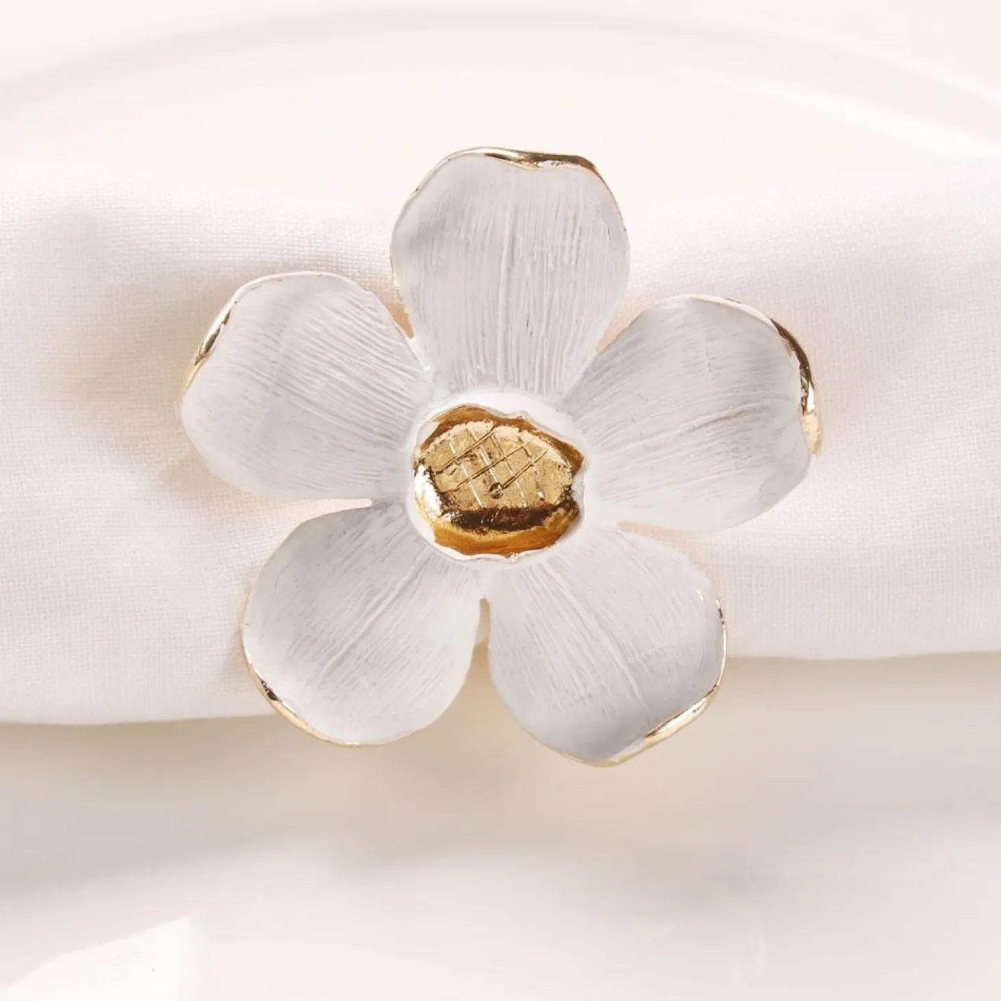 The Isla napkin ring is an elegant addition to any tablescape. The elegant flower curls slightly revealing a gold finish underneath. The brushed white petals add to the intricate detail and beauty.