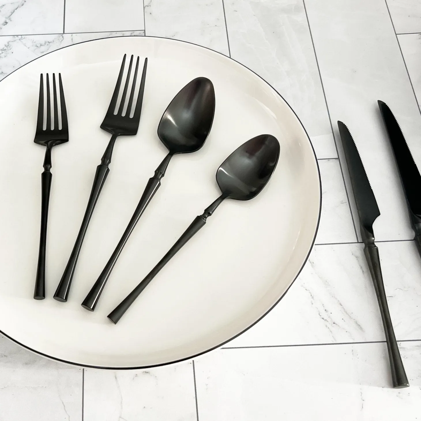 Striking and sophisticated, this nicely weighted black flatware set brings a touch of modern luxury to your table. Its sleek silhouette and balanced design make it the perfect complement to our Black Rim Dinnerware, creating a look that’s both refined and contemporary.
