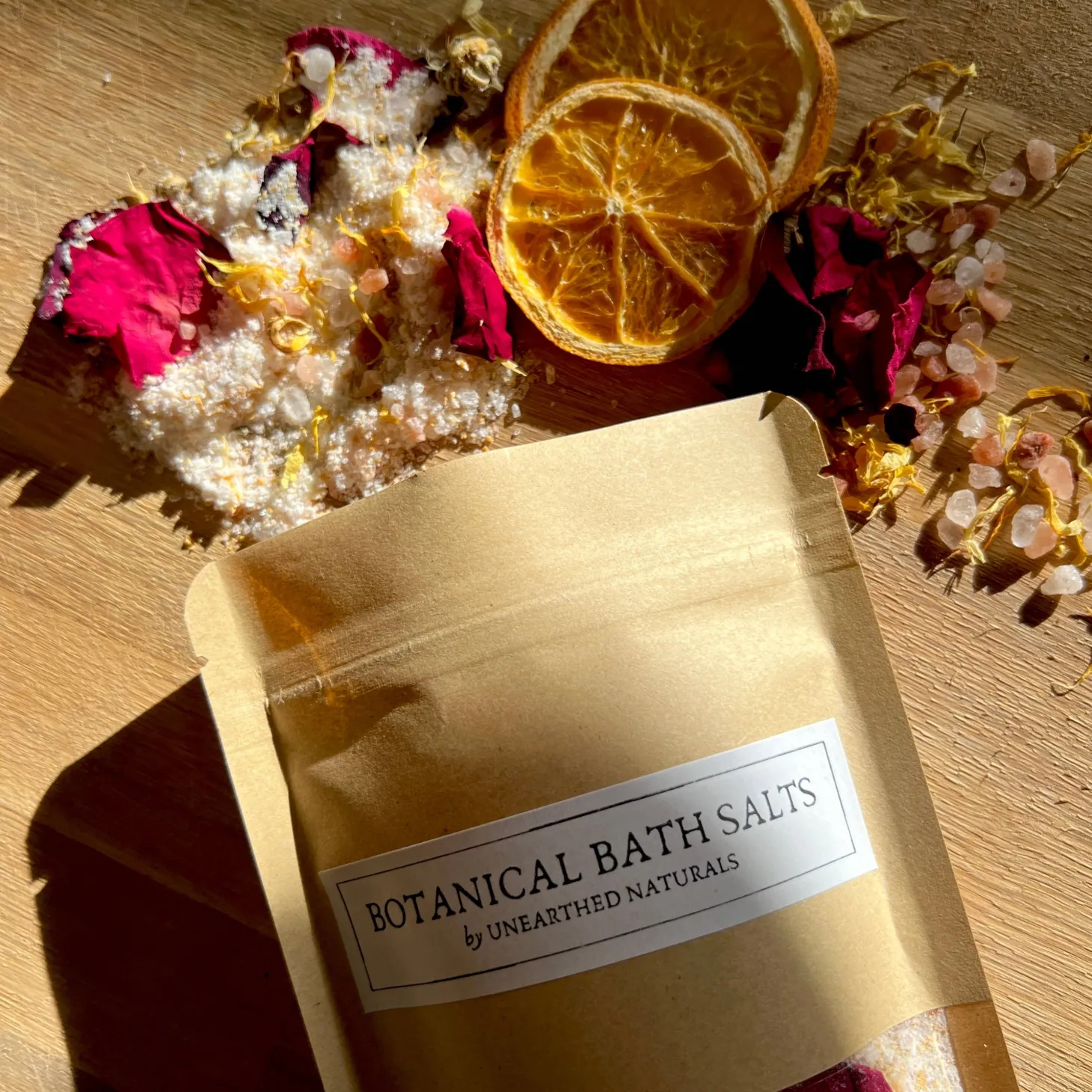 Himalayan pink salt, Epsom salt, baking soda, dried rose petals, calendula petals, dried orange peel