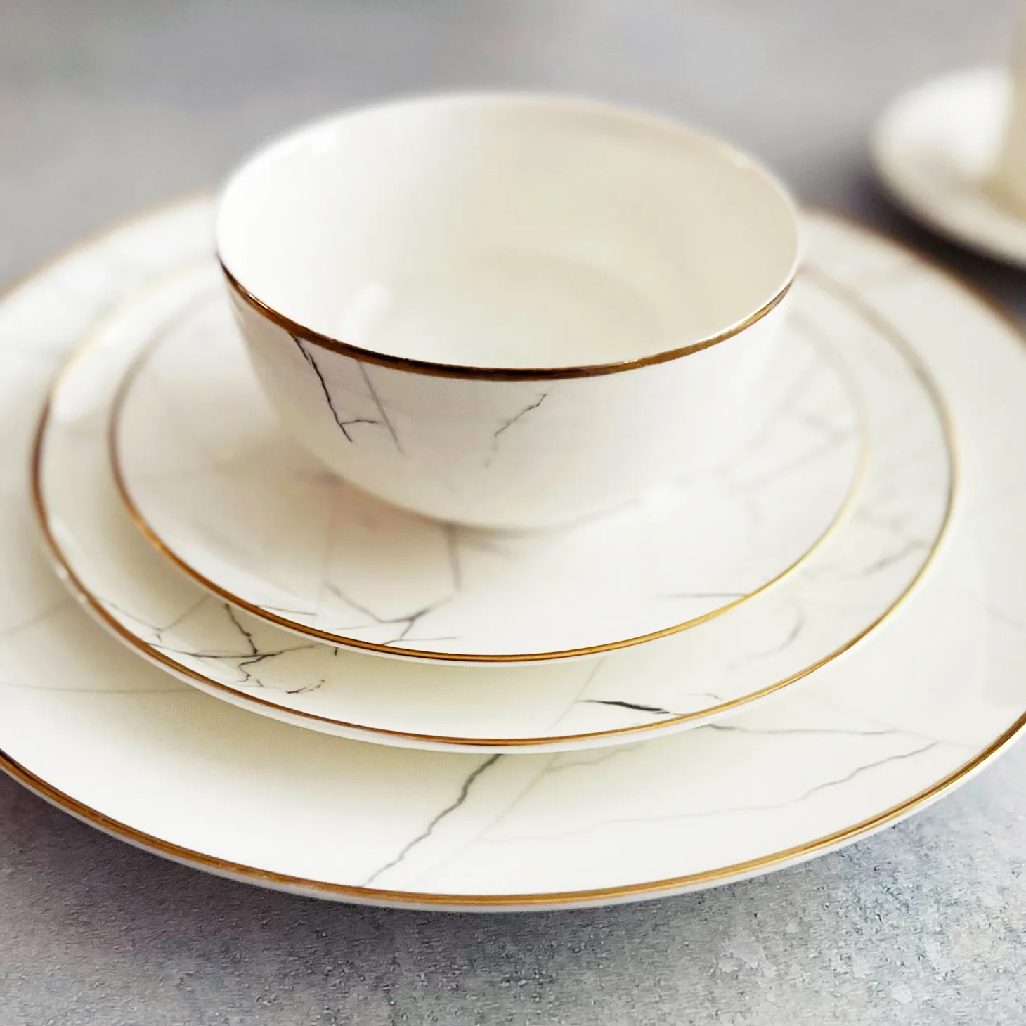 Elevate your dining experience with this elegant marble dinnerware set—sophisticated enough for formal gatherings, yet effortlessly stylish for everyday use. Each piece features soft gray marble veining and a delicate gold rim, crafted from the highest quality fine bone china.