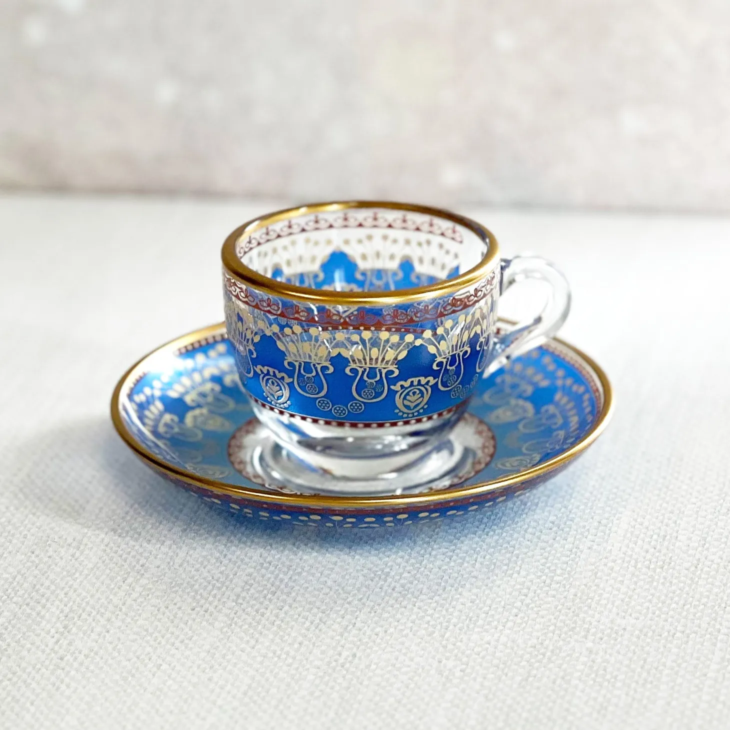 Clear glass is painted with gorgeous saturated blue, maroon and yellow delivers a beautiful drinking cup for coffee or tea.