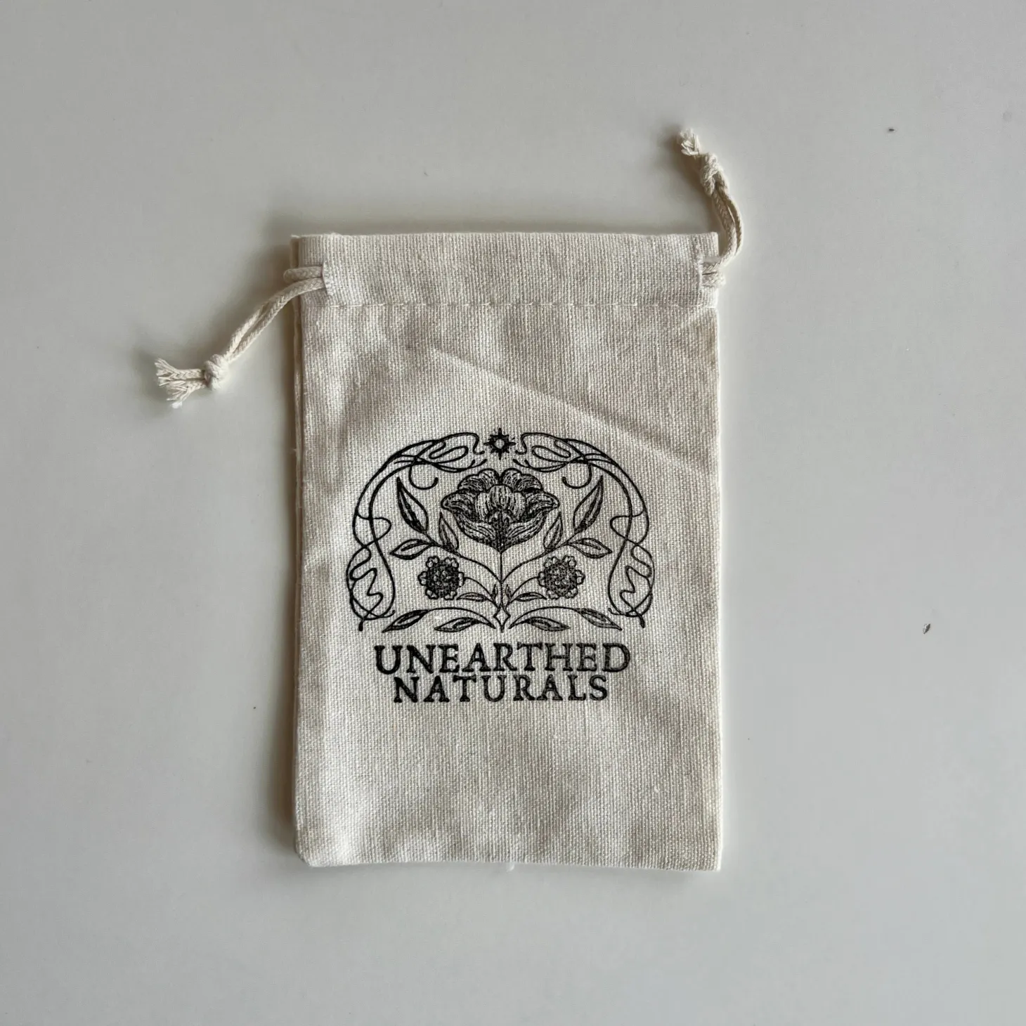 Elevate your bath ritual with our eco-conscious cotton muslin soak bags, the perfect companion for botanical bath salts and herbal blends. Each 4×6 inch bag is hand-stamped with the Unearthed Naturals logo and crafted from thick, durable cotton with a double-drawstring closure for easy use and a secure seal.