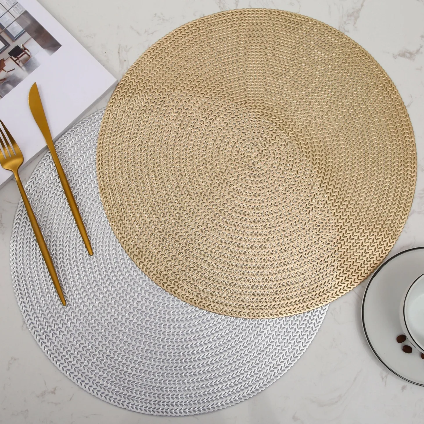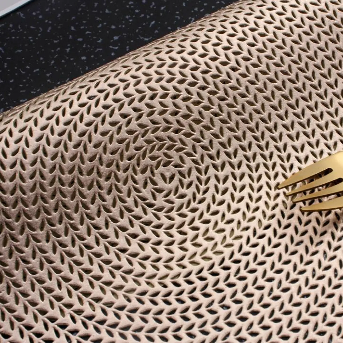 Our round vinyl placemat features a cutout pattern of leaves making it a beautiful backdrop for your tableware.