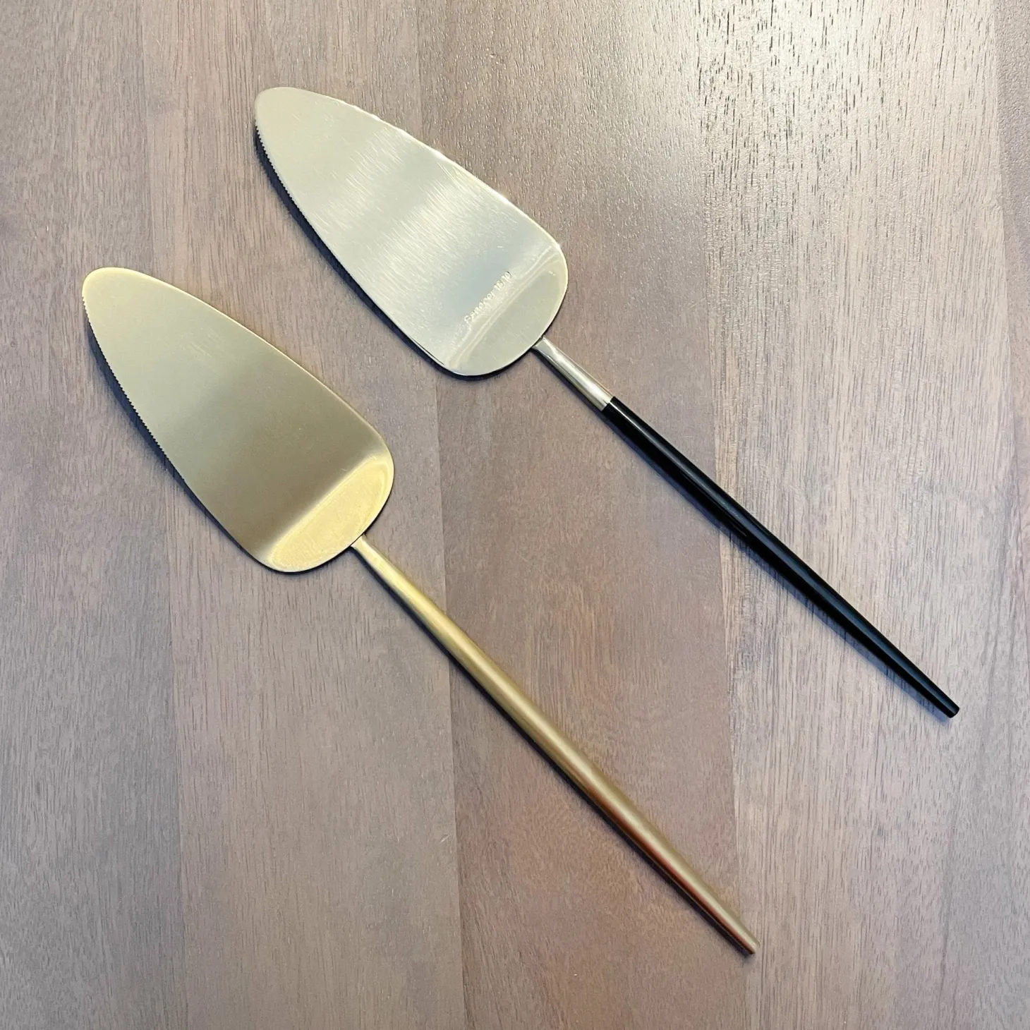 The Sandoor cake stand is an elegant choice for serving pies and cakes. The handle is long making it well balanced for serving. The all gold version has a matter finish. The black and gold version has a polished gold head and sleek black stem.