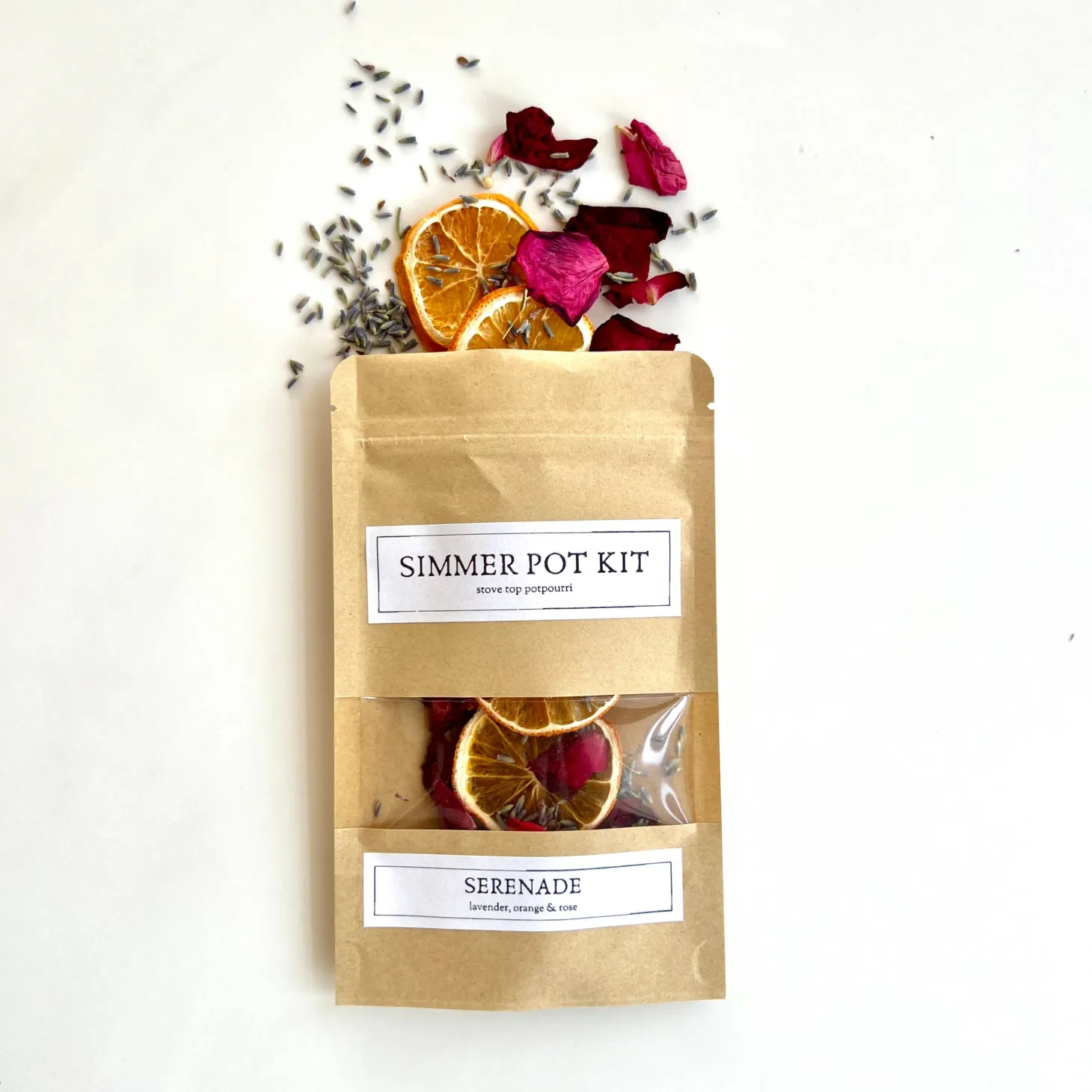 Create a soft, soothing atmosphere at home with our Serenade Simmer Pot Kit. This handcrafted stovetop potpourri blend layers calming lavender, delicate rose petals, and bright citrusy orange to create an ambiance that is both relaxing and gently uplifting. A beautiful, natural way to refresh your space without artificial fragrances or harsh chemicals.