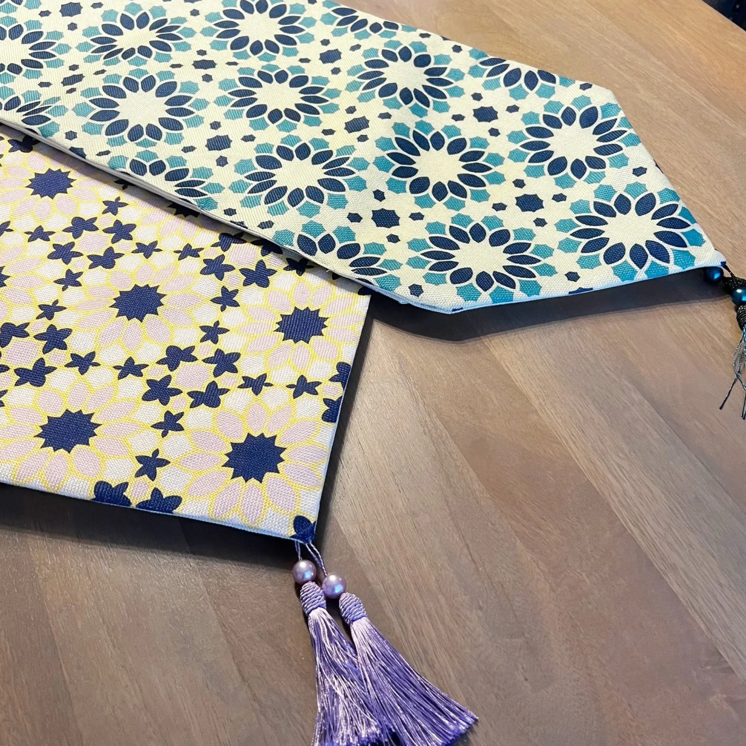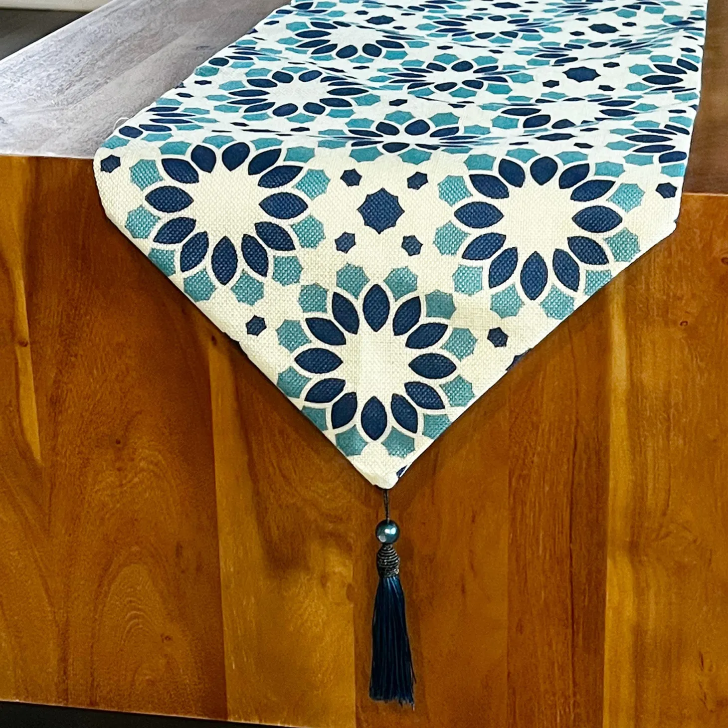 This table runner uses geometry and negative space to play on traditional patterns. Dark and light blues with green tones make this easy to pair with dinnerware and decor.