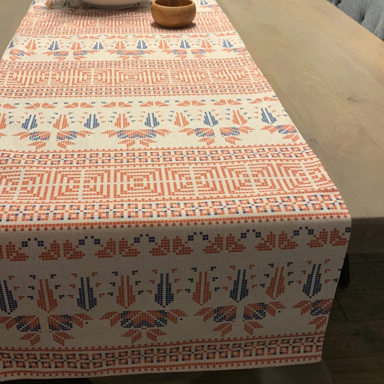 This table runner carries that story forward through a printed interpretation of traditional embroidery motifs, thoughtfully rendered on durable linen. Designed for everyday living as much as meaningful gatherings, it is machine washable, bringing modern ease to a storied tablescape.