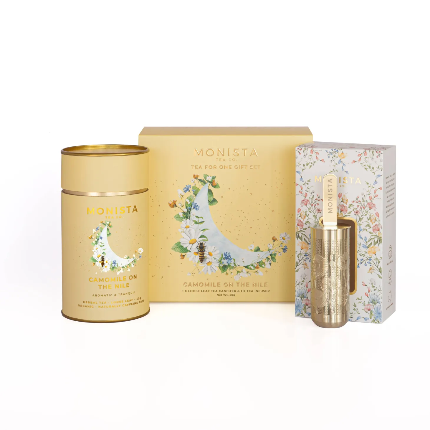 This elegant gift set includes Monista’s Camomile on the Nile loose leaf tea and a sleek gold stick infuser — everything needed to unwind with a single, soothing cup.