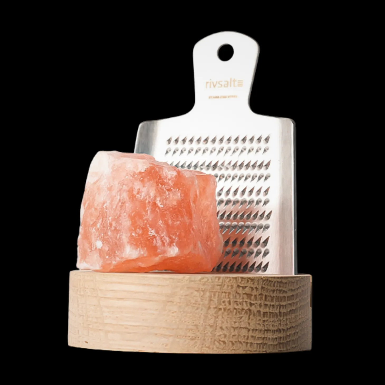 RIVSALT transforms a simple seasoning moment into a table-side ritual. A hand-selected Himalayan salt rock is paired with a finely crafted Japanese-style stainless steel grater, allowing guests to grate pure, natural salt directly over their dish. When not in use, the salt and grater rest in a sculpted oak stand that turns the set into a warm, tactile centerpiece.