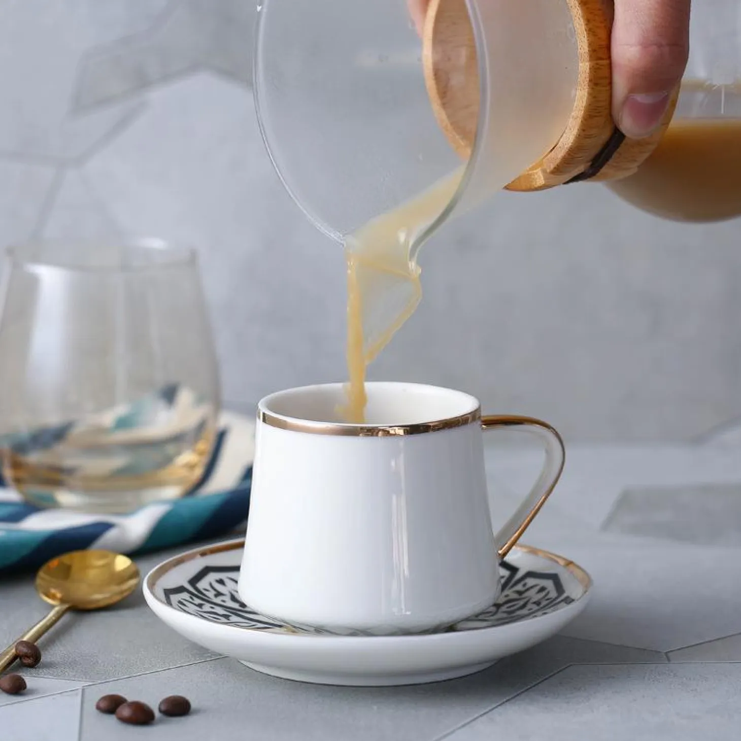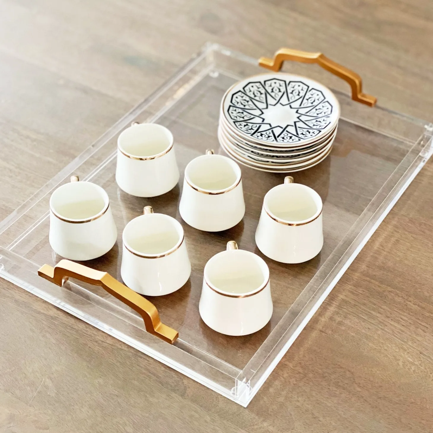 Enjoy a cup of Turkish or Arabic coffee in style. This set includes 6 porcelain cups and 6 saucers. The 80mL is perfect for espressos or Turkish tea while the larger size can be used for your favorite pour over or drip coffee.