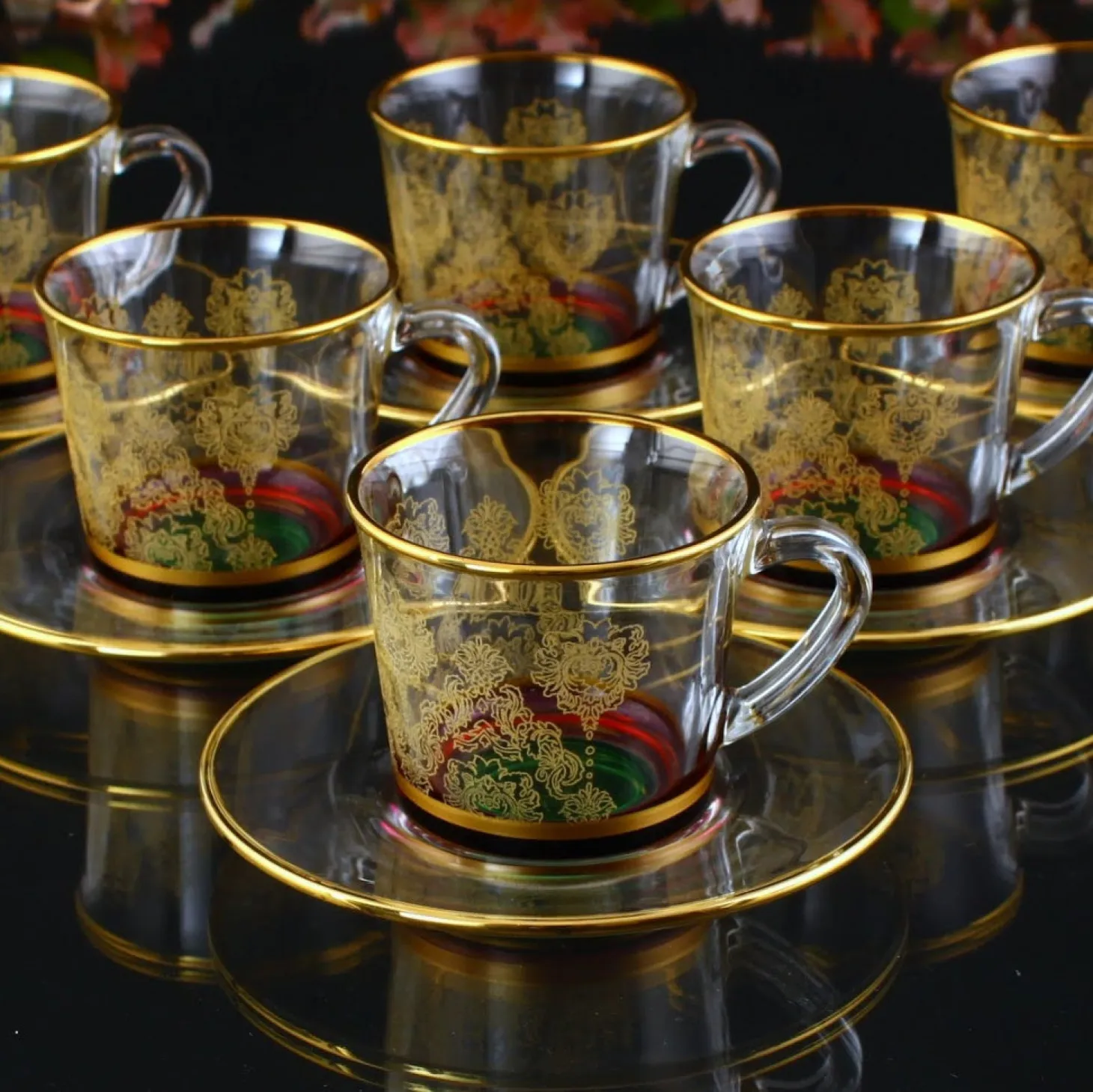 Enjoy your favorite caffeinated beverage in style. The Turkiye coffee set comes with 6 glass cups and 6 saucers. Each cup is painted intricately in a gold motif with a hint of color.