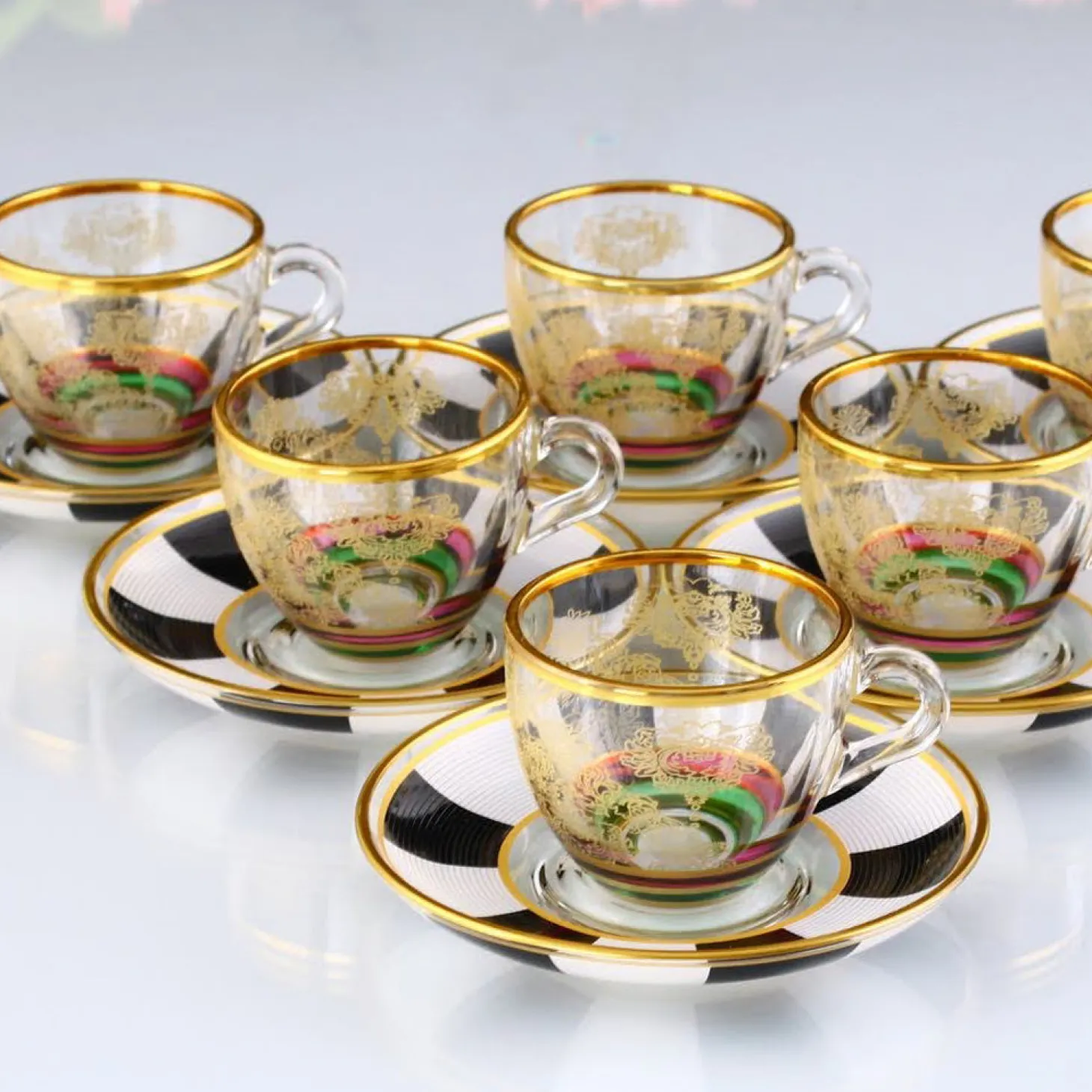 Enjoy an espresso in the Turkiye coffee set. Each cup is painted intricately in a gold motif with a hint of color. The saucers feature a contrasting black and white stripe pattern.