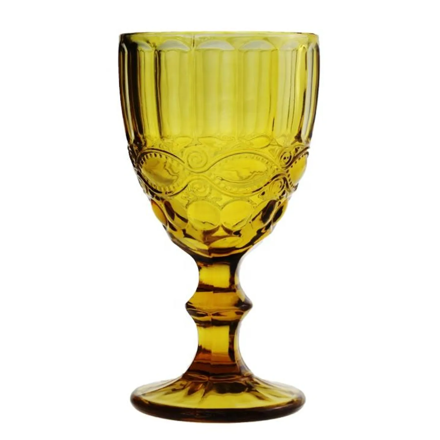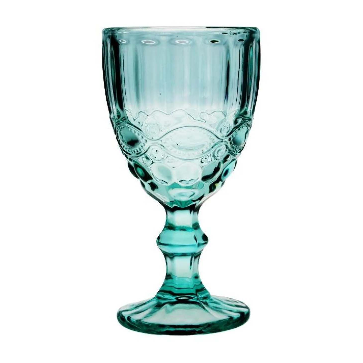 Inspired by 20th century pressed glass, our Alice water goblets feature an ornate pattern of organic shapes and ribs that add color and shine to any table setting.