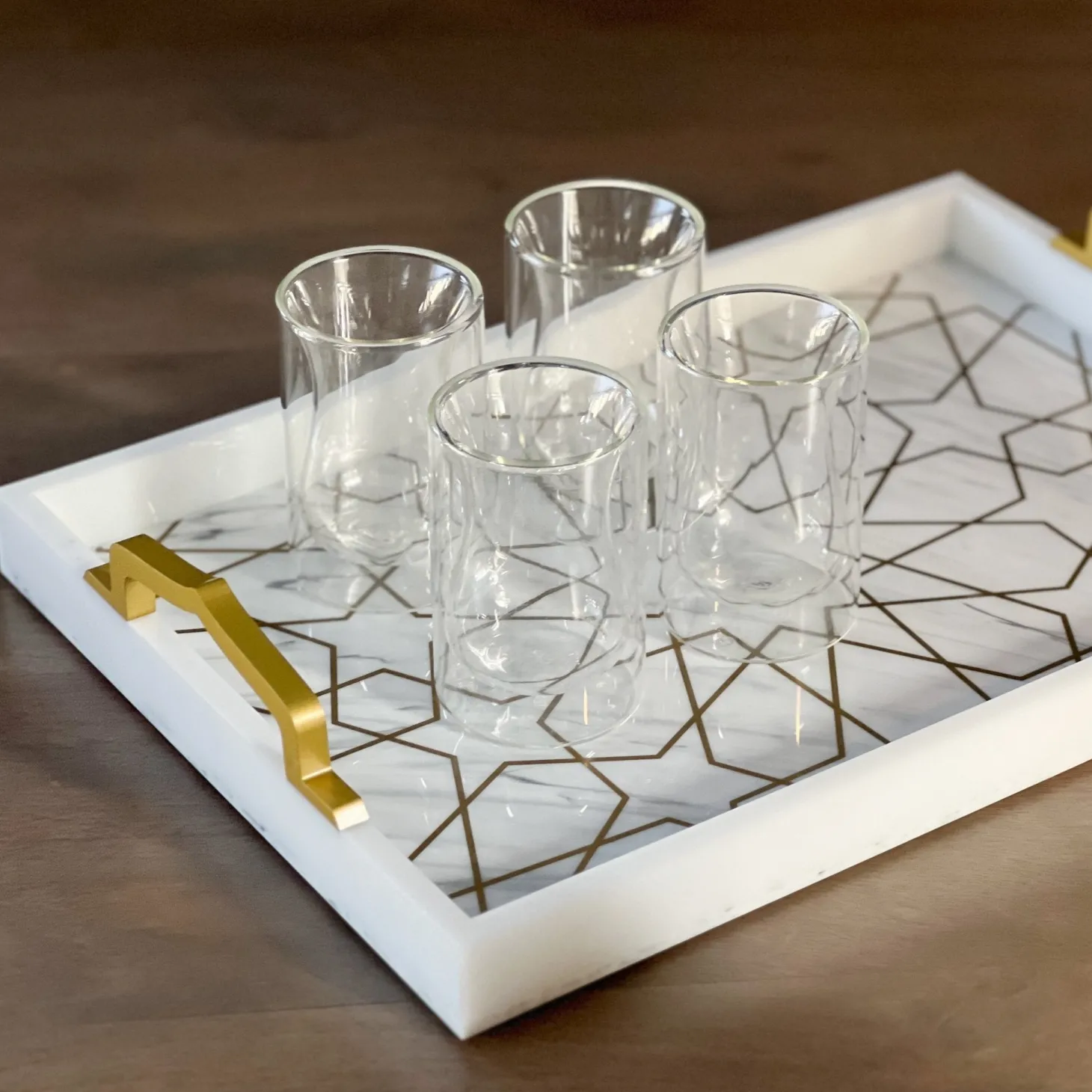 Th look of marble with the light weight modern feel of acrylic make this the ultimate coffee table staple. The Andalus tray features an arched gold handle inspired by ancient Moorish architecture.
