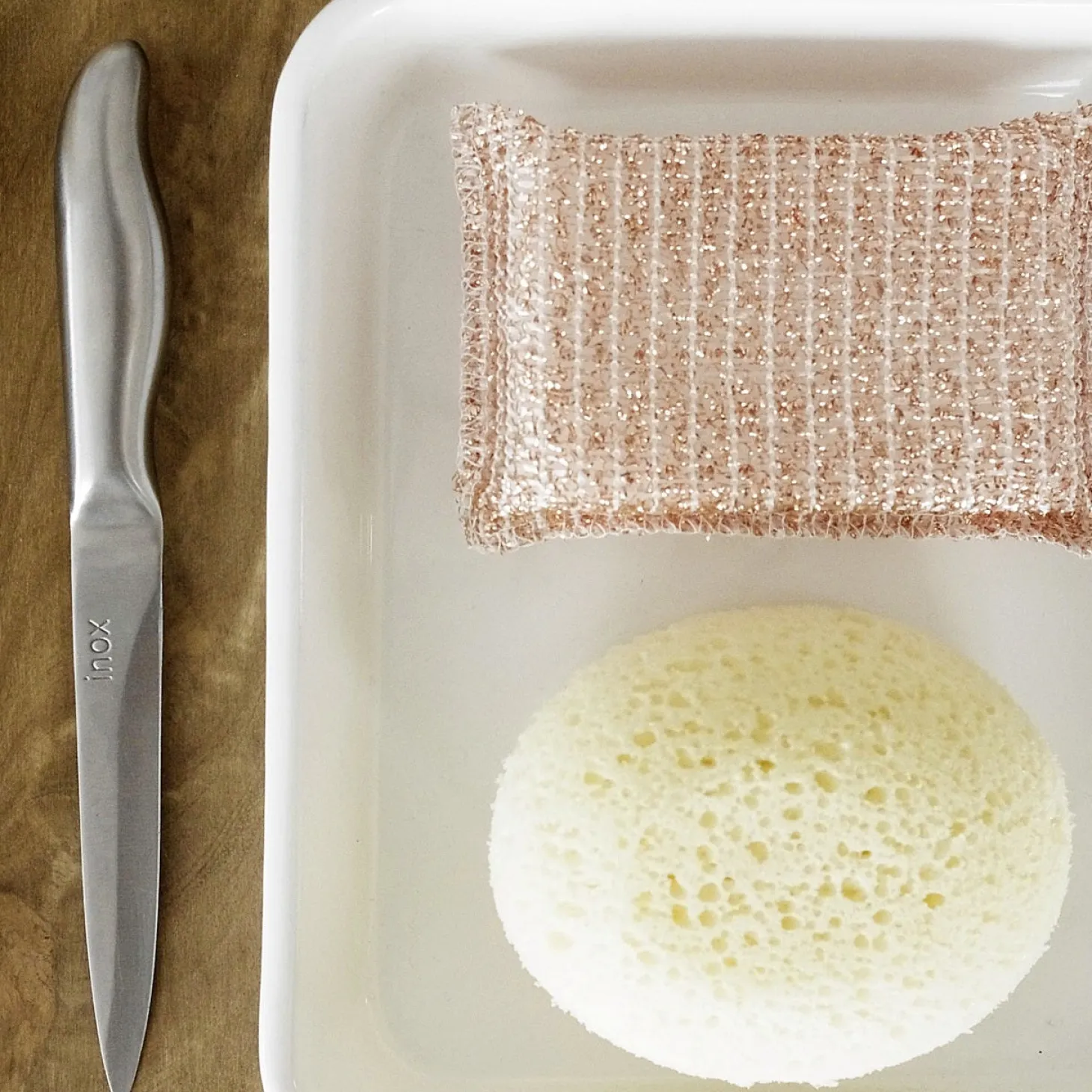 Thanks to the copper wire lacing, this sponge effectively cleans stainless steel, glass, ceramic and other delicate appliances and surfaces without scratching. Comes wrapped with coated paper label.