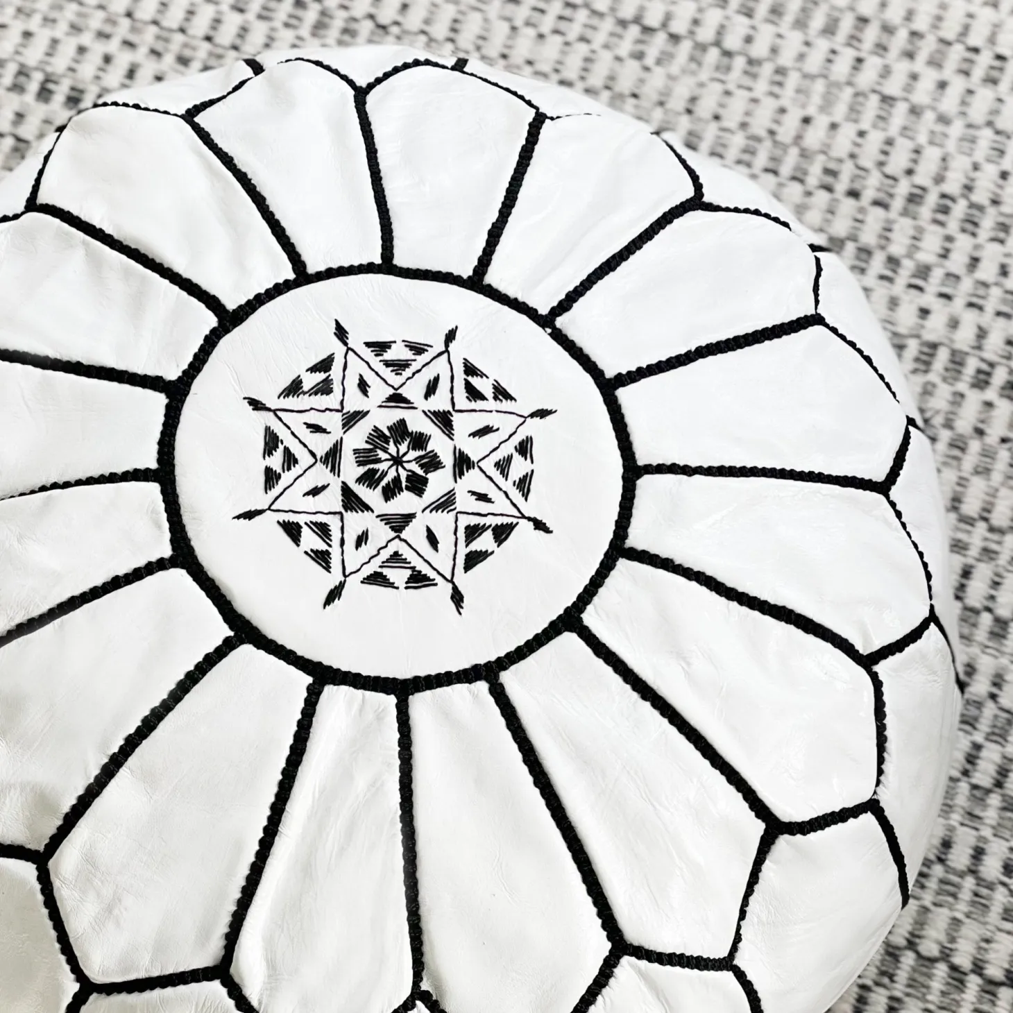 Our 100% leather pouf in white leather with black stitching is a modern twist on the traditional pouf. Add additional seating to a room or use as a foot rest in front of your favorite arm chair.