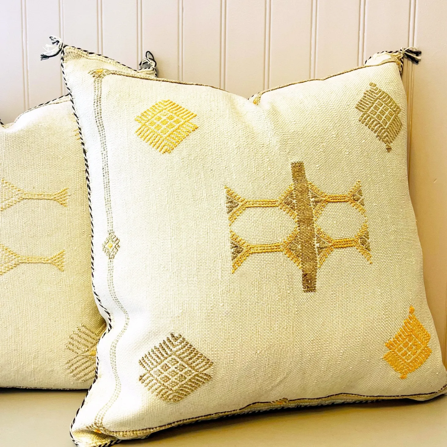 The Moroccan Cactus Pillow Cover is handmade by Moroccan artisans. The base of the pillow is a beige and is adorned with yellow and black stitching. This pillow cover is handmade from cactus silk also known as vegetable silk.
