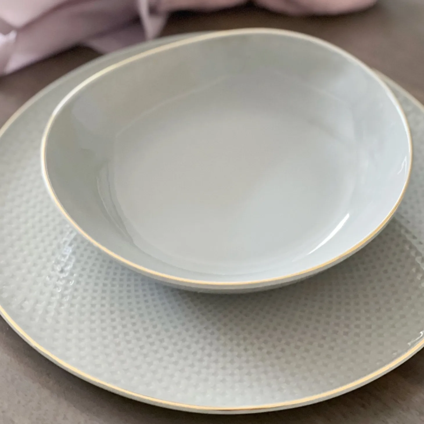 The simplicity of the art deco inspired pattern is balanced with a slightly organic shape and finished with a thin gold rim. The Camille dinnerware in comes in a soft gray that’s versatile and timeless.