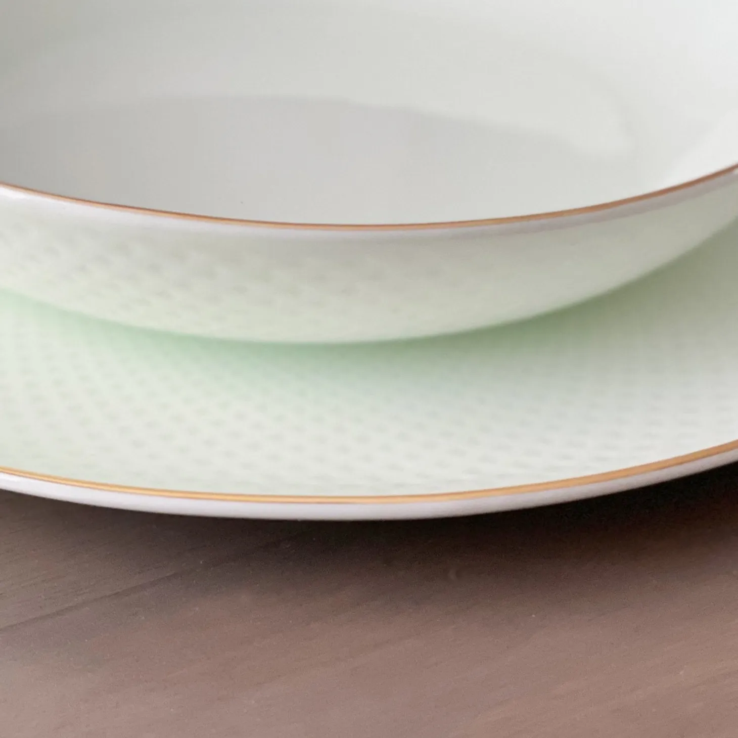 Elegant and timeless, the Camille Dinnerware Collection draws inspiration from Art Deco design, where simplicity meets sophistication. The subtle green undertone of the white glaze adds a soft, unexpected depth, while a delicate gold rim lends a refined, luminous finish. The slightly organic silhouette gives each piece a graceful, handcrafted feel.