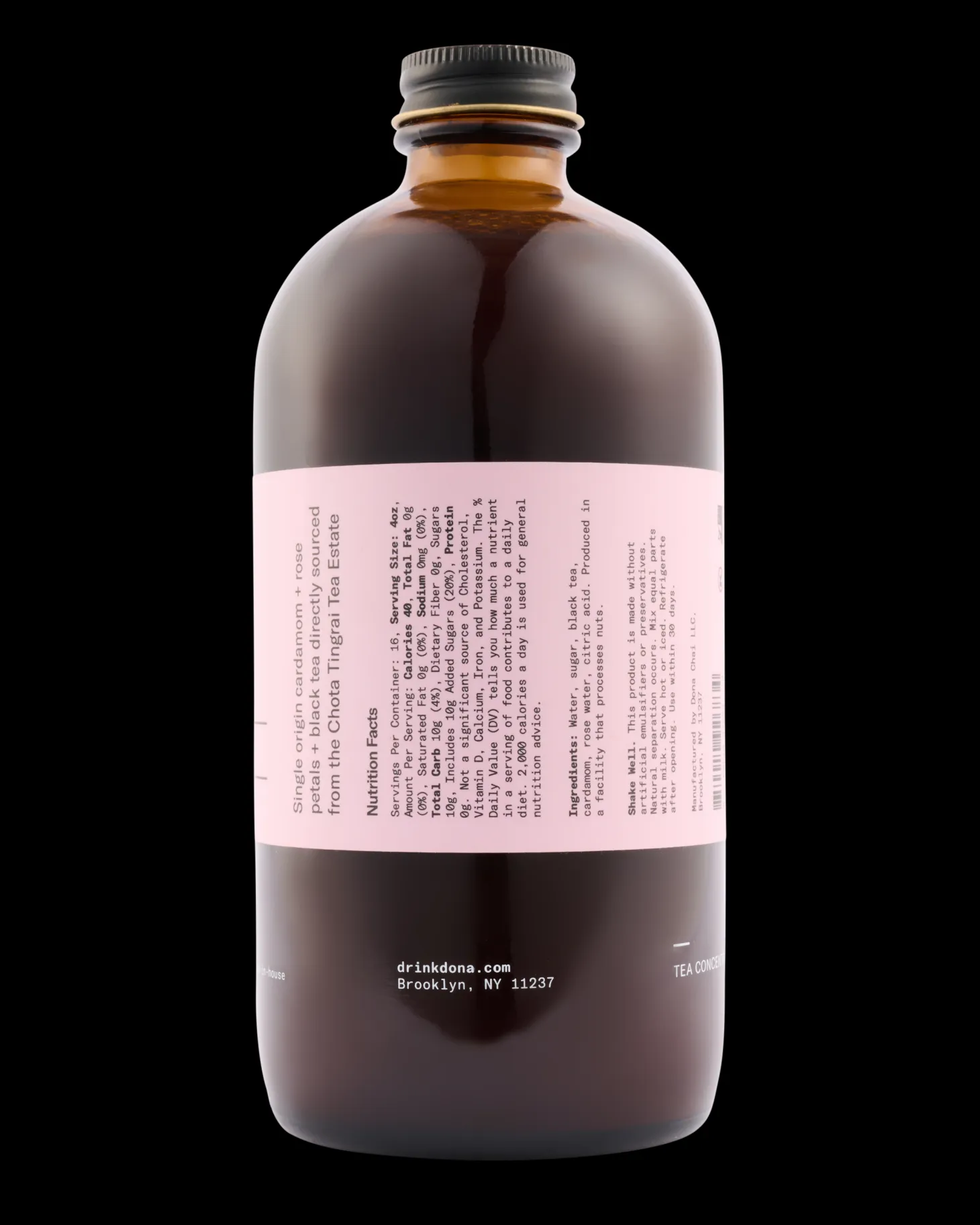 Filtered water, sugar, black tea, cardamom, rose petals, citric acid.