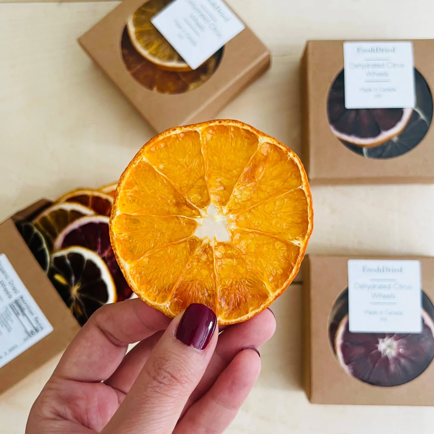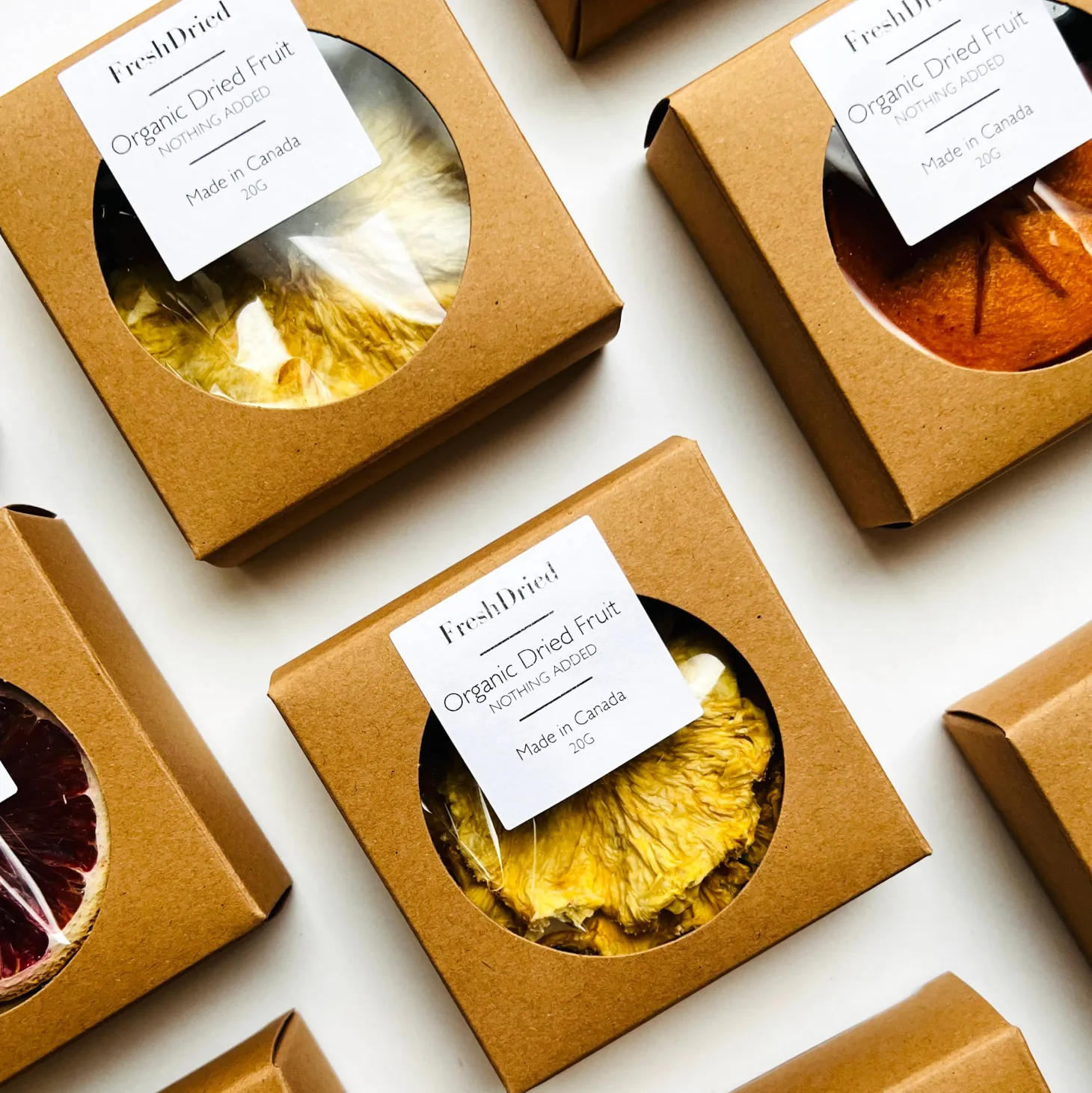 Each box contains 15–20g of 100% natural dehydrated fruit. Choose from: blood orange, cara cara orange, navel orange, grapefruit, tangerine, lemon, and lime, apple, pear, persimmon, pineapple, kiwi, and peach.