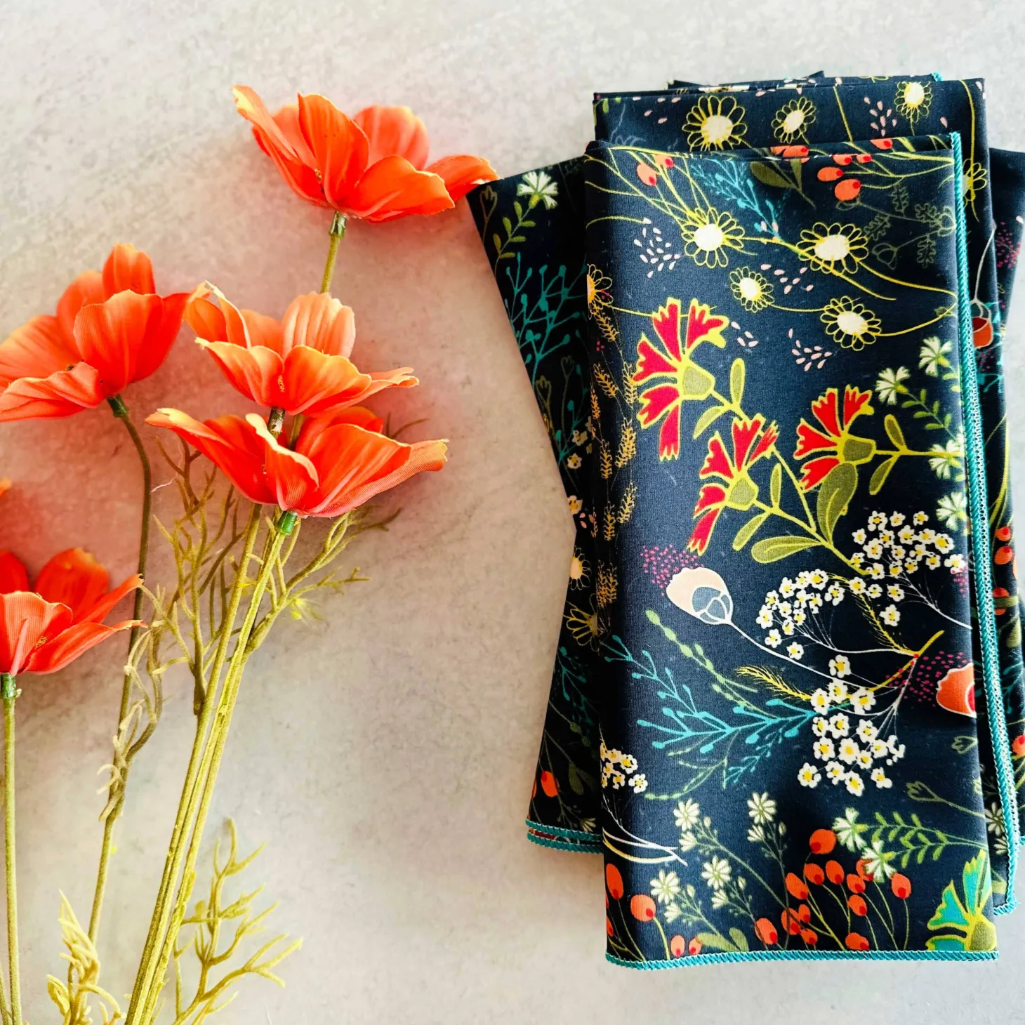A vibrant print featuring navy blue with pops of coral, teal, lime, and soft pale pink brings color and charm to any table setting. Crafted from super-soft 100% cotton, these napkins are both beautiful and practical — easy to care for and made to last.