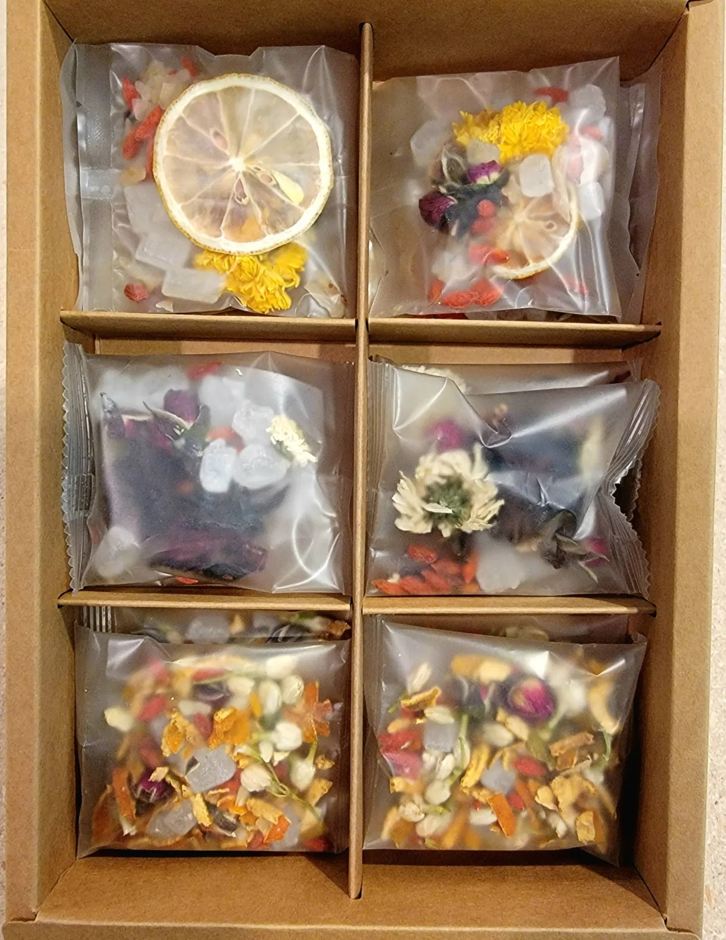 Explore a beautifully curated collection of herbal and floral tea blends, thoughtfully packed to provide a unique and soothing experience. Perfect for daily rituals or a special gift, every package combines natural ingredients like dried fruits, flowers, herbs, and a touch of rock sugar for gentle sweetness.