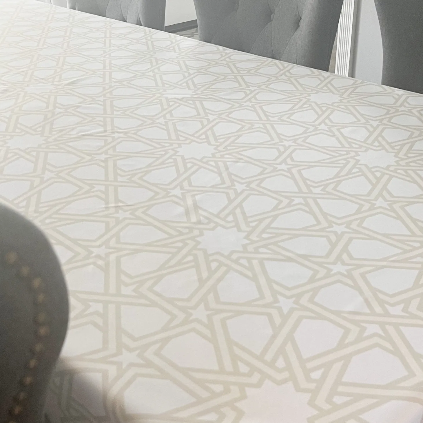 The Girih tablecloth consists of a geometric pattern of stars and polygons without a beginning or an end, portraying a sense of infinity. The light hues of yellow and subtle neutrals make a perfect backdrop for your tableware.
