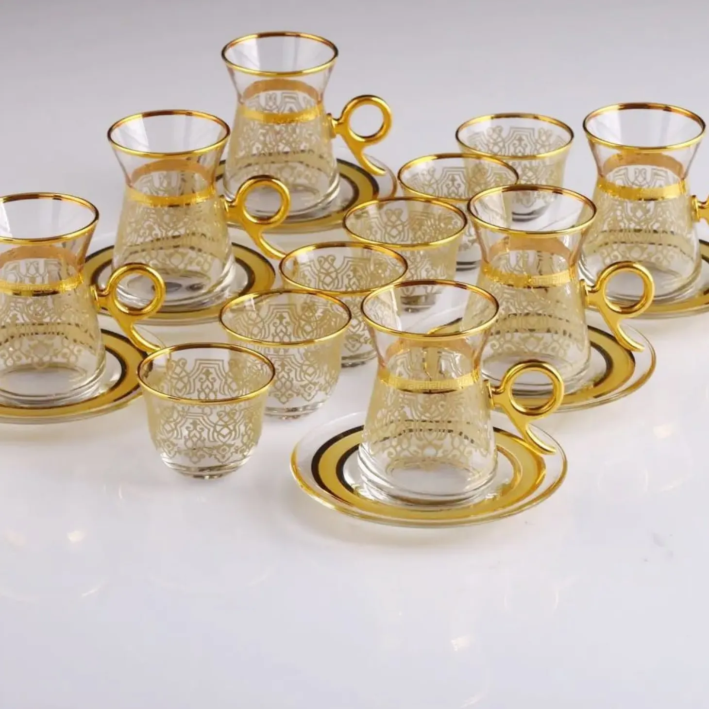 One of our best selling tea cup sets now comes as a gift set with tea cups, saucers and coffee cups. The traditional tea glass shape is accented with gold tones and an ornate motif.