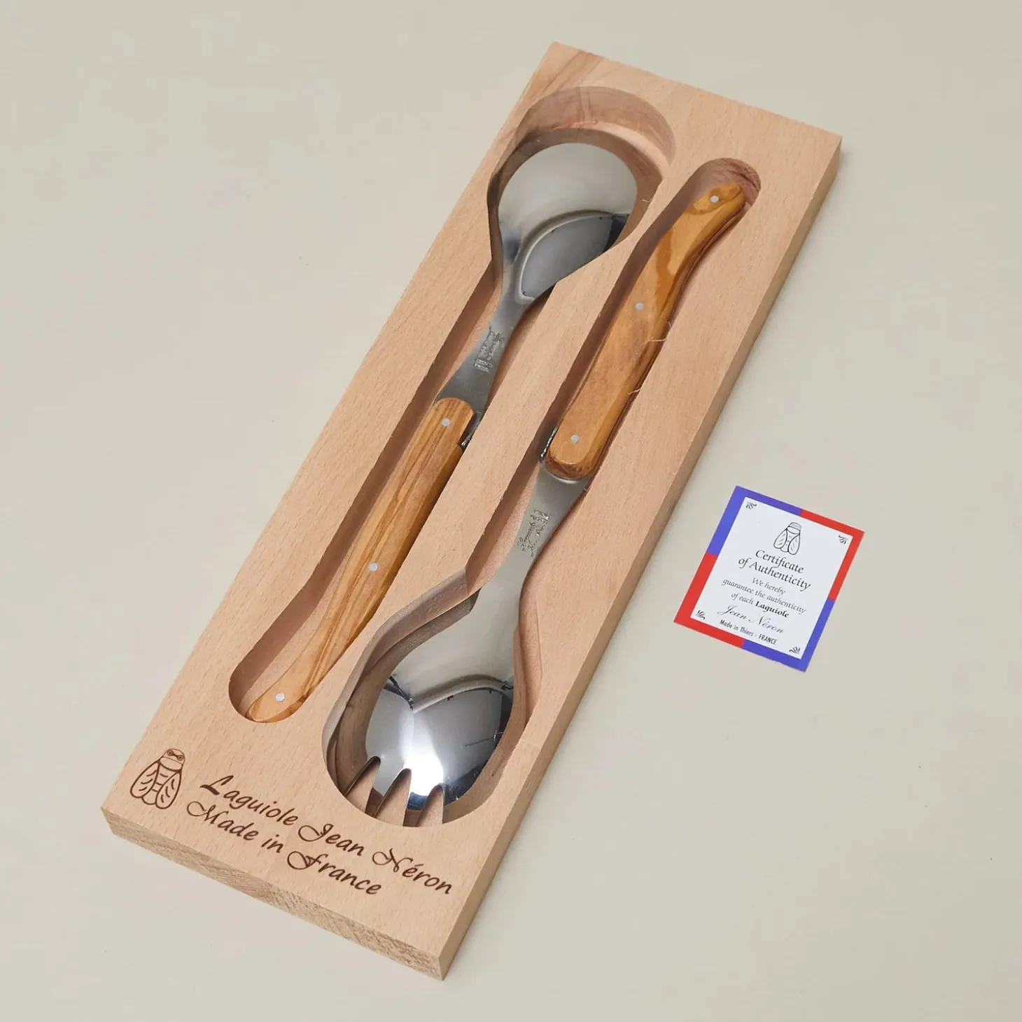 The Laguiole French stainless steel salad serving set includes 1 salad spoon and 1 salad fork, and features durable, man-made olivewood handles. Presented in a wood tray featuring the Napoleonic bee detail that delineates the high-quality of Laguiole France.