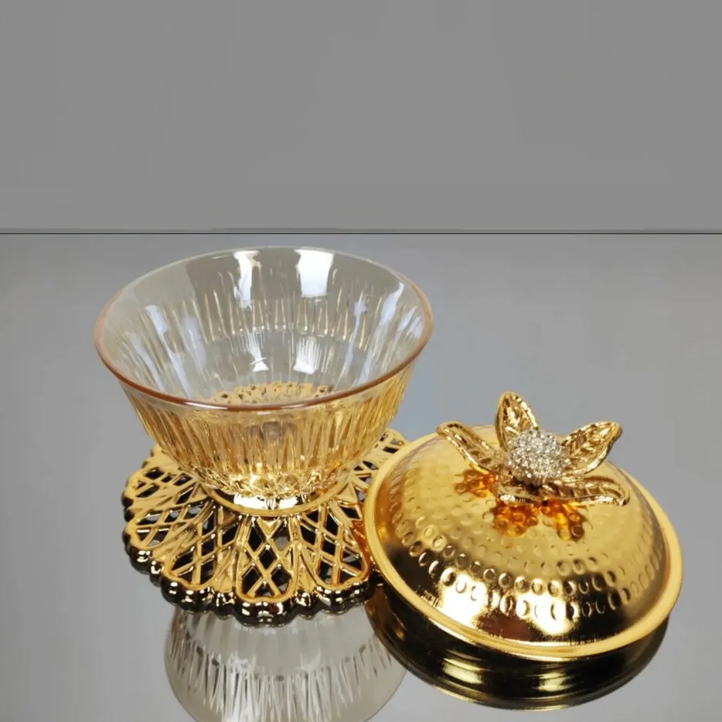 If you’re looking for a glam sugar bowl, you’ve found it! The Mei sugar bowl features an intricate base, glass bowl and is topped with a hand hammered lid. Finally, a lovely daisy sits atop the lid.