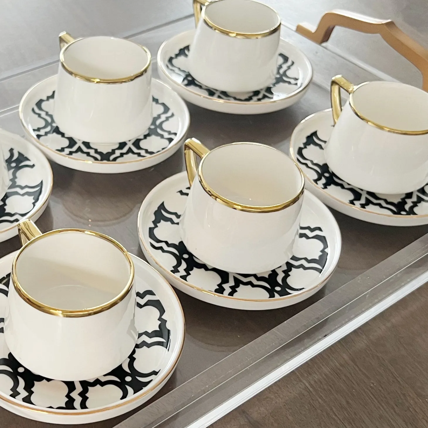 An elegant cup sits atop a gorgeous contrast of black and white pattern and gold rim. The Pelen coffee cups and saucer set serves 6.