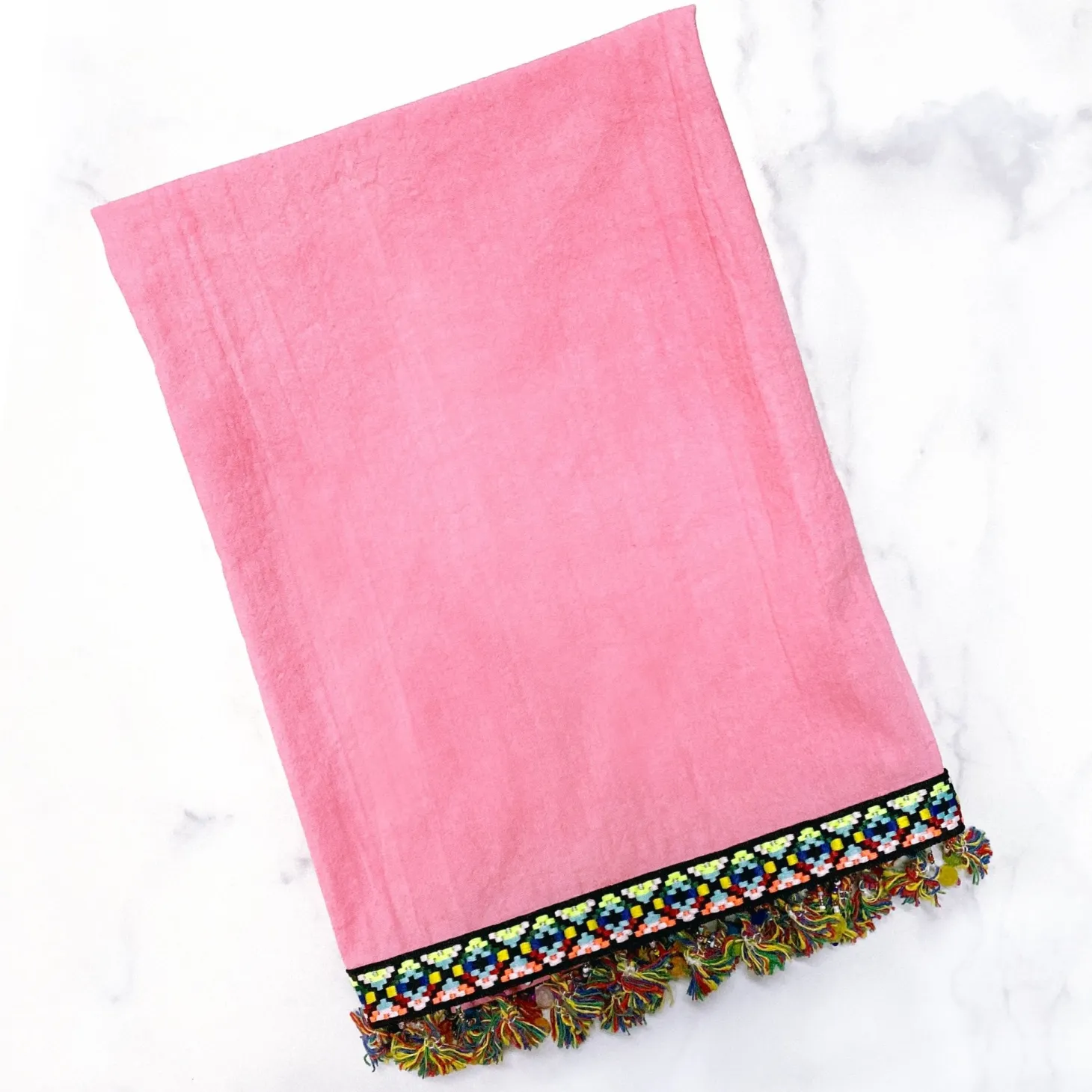 This hand dyed pink towel is finished with colorful edging. Towels are 100% cotton and are super soft and absorbent.