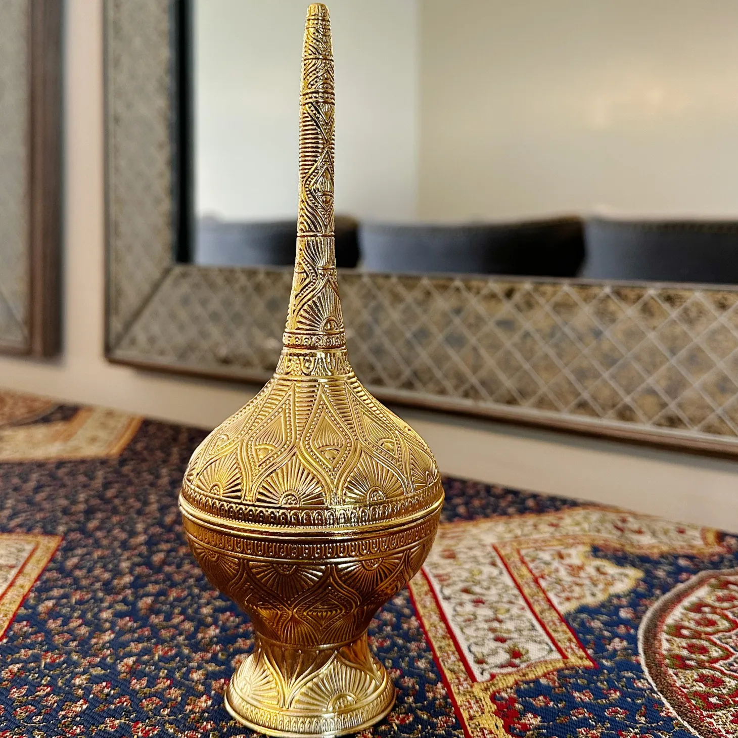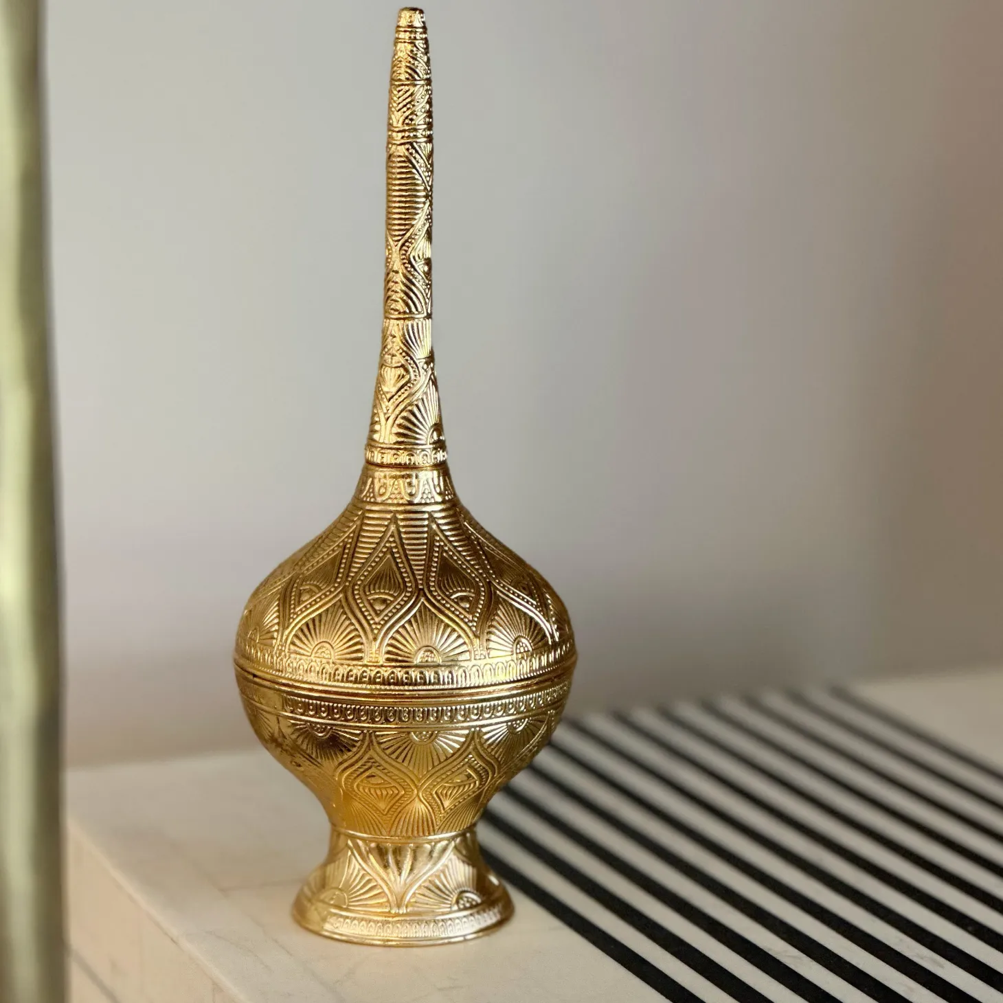 This zinc casting fragrance diffuser is an ornate way of elevating your senses. Add fragrance/essential oils in the bottom half and screw the top back on or choose to add reeds. Reeds and oils not included. Top portion has a small opening allowing the fragrance to diffuse over time.