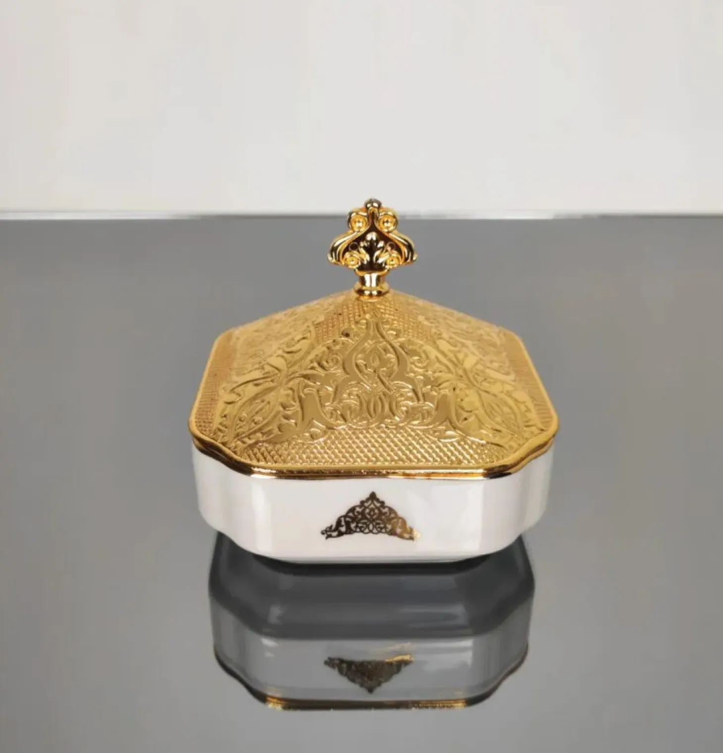 If you’re a snacker, you get it. Keep your favorites nibbles close by in this porcelain dish with ornate zinc lid.
