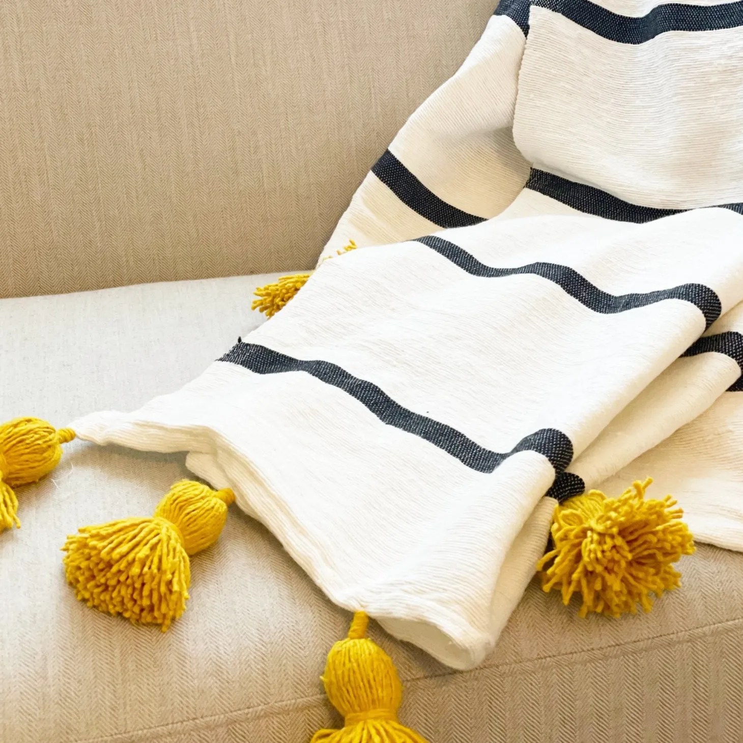 Add a touch of playful charm to your space with this cozy handwoven blanket, adorned with cheerful yellow pom poms. Crafted by Berber weavers in the Atlas Mountains of Morocco, each piece reflects generations of craftsmanship and cultural artistry.