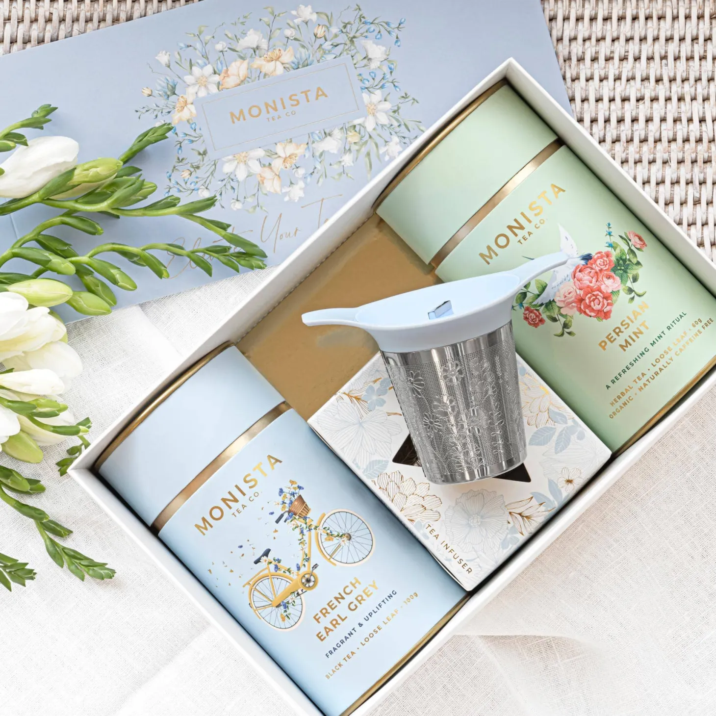 Presented in a keepsake Monista gift box adorned with a delicate colored floral sash, this set is ready to delight from the moment it is received.