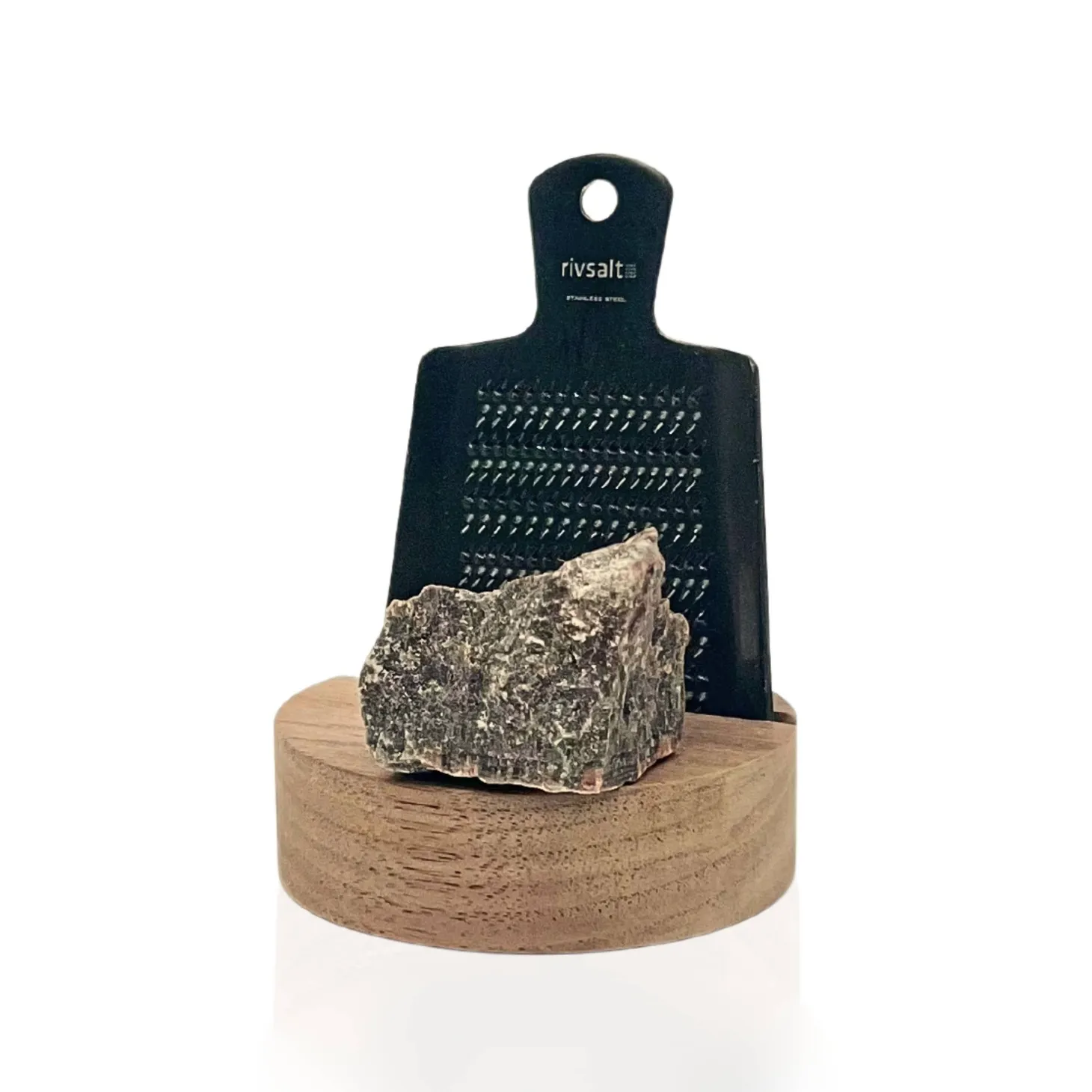 This RIVSALT set includes a Japanese-style grater in black-coated stainless steel, an intensely flavored Kala Namak rock salt, a Himalayan rock salt, and a richly grained walnut table stand. Each element is thoughtfully composed and packaged in an elegant cardboard gift box, making it ideal for gifting or elevating everyday dining.