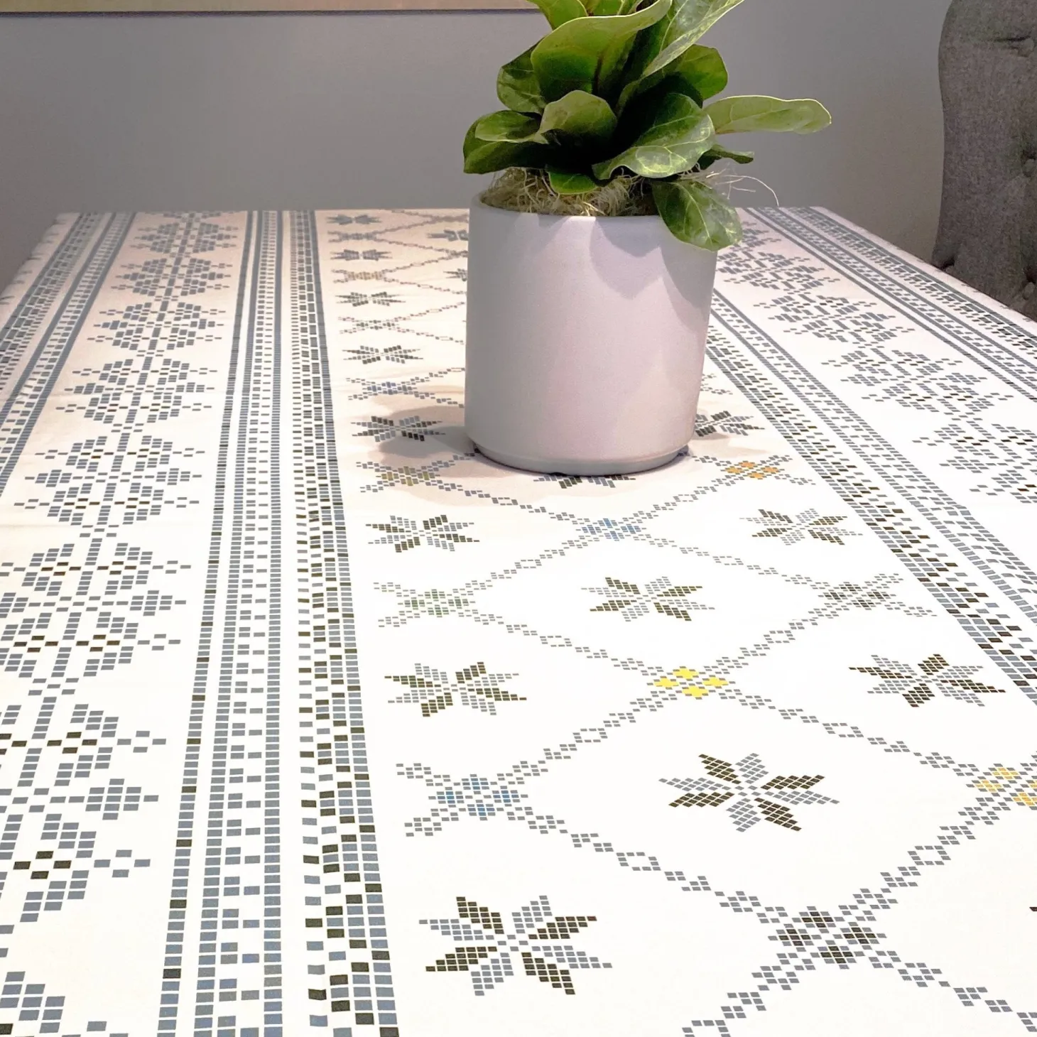 Bring heritage and artistry to your table with this embroidery-inspired tablecloth, designed to echo the look of traditional hand-stitching. Each pixel-like motif forms an intricate tapestry of rich blues, sunny yellows, and soft greens, blending old-world charm with modern craftsmanship.